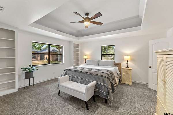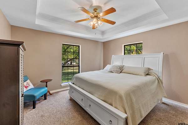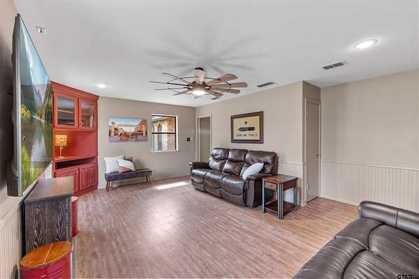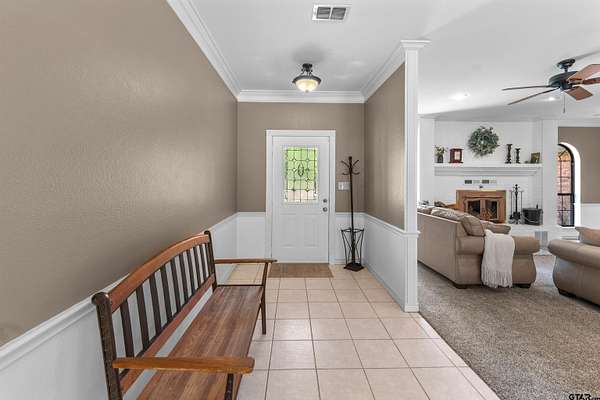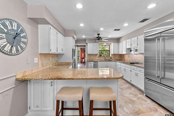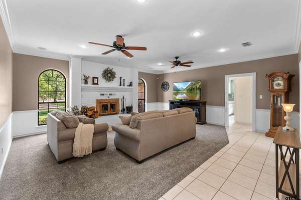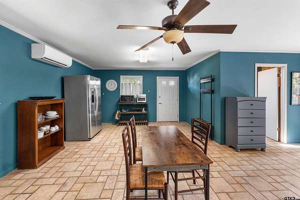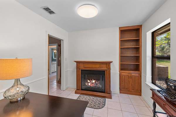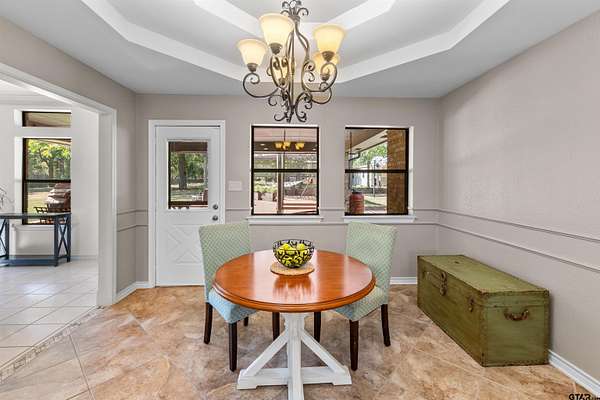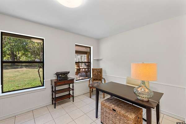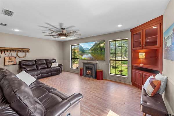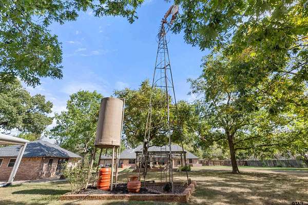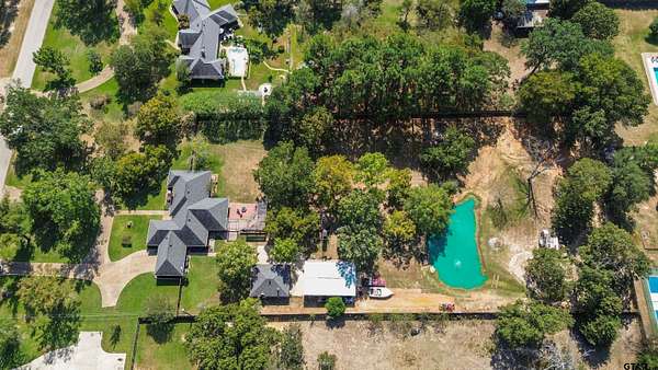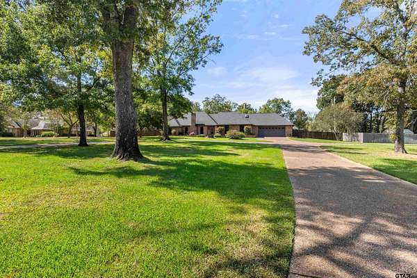 Incredible Rare Find on 2.57 Acres in Flint, TX! This property truly has it all--space, charm, and functionality--set on 2.57 acres of peaceful, park-like grounds. From the moment you pull up, you'll be impressed by the immaculate curb appeal, circle drive, and beautifully maintained landscaping that welcomes you home. Inside, the 2,572 sq ft main home offers a warm, inviting feel with a spacious living room anchored by a wood-burning fireplace complete with blowers that can heat multiple rooms. The layout features 3 bedrooms, plus a versatile 4th that could serve as a game room or second living area, along with a dedicated office, formal dining room, and an eat-in kitchen designed for gathering. The kitchen is a showpiece with granite countertops, bar seating, a built-in KitchenAid refrigerator and freezer, and plenty of room for family or entertaining. The primary suite is a retreat of its own, featuring a tray ceiling with recessed lighting, two large walk-in closets--one thoughtfully converted into a reinforced safe room/tornado shelter--and a spa-like bath with double sinks and a walk-in shower. Step outside to your own private oasis. The covered back porch overlooks mature trees and manicured landscaping, while the backyard features a solar-powered pond fountain, cozy fire pit, and charming pergola. The stocked pond is ready for lazy afternoons of fishing or unwinding by the water. Also included is a 400 sq ft guest house with a full bath and space to add a kitchenette--ideal for visitors, extended family, or even a private home office. The 26x44 workshop is a dream setup with one single and one double overhead door, plus a mini-split system for year-round comfort. Rounding out this incredible property are thoughtful extras like a decorative windmill, 750-gallon rainwater collection system, and scenic surroundings that make every day feel like a getaway. Additional features include Trimlight system on overhangs and new 6" gutters - call for your appointment today!