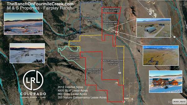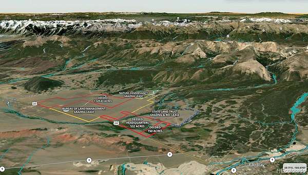 Just outside the historic mountain town of Fairplay, TheRanchOnFourmileCreek (dot com) spans a vast expanse of high-country grassland surrounded by panoramic mountain views and endless recreation. Over 1.5 miles of Fourmile Creek meander through the property, offering private fly-fishing in a pristine alpine setting. The landscape invites adventure—hunting, hiking, horseback riding, and exploration—all within an unspoiled natural environment.The ranch’s 2,012 deeded acres also qualify the owner for Landowner Preference hunting tags (14 issued in 2024), with direct access to adjacent BLM, State, and Nature Conservancy Grazing Leases totaling more than 3,000 additional acres (subject to agency approvals). Despite its seclusion, the ranch is ideally located 2 miles from town—just 30 minutes to Breckenridge for world-class skiing, extensive dining, golf & shopping and Buena Vista for whitewater rafting, the Arkansas River headwaters recreation area and the Central Colorado Regional Airport with a 8,300' runway. At the heart of the property, a 3,754 sq ft custom home offers four ensuite bedrooms, an open-concept great room with two-story windows, and breathtaking views of Buffalo Peaks and the surrounding ranges. A newly upgraded off-grid solar system with battery storage and propane backup generator ensures reliable, sustainable power. Complementing the home is an 8,000 sq ft heated steel barn with paddocks, ideal for horses or equipment. Framed by the Mosquito Range, Silverheels, Buffalo Peaks Wilderness, the Sangre de Cristo Mountains, and Pikes Peak, The Ranch on Fourmile Creek embodies the rare balance of privacy, scenery, and authentic Colorado ranch heritage—protected for generations through thoughtful stewardship and conservation.