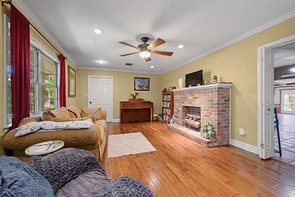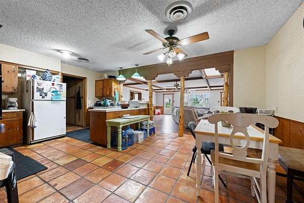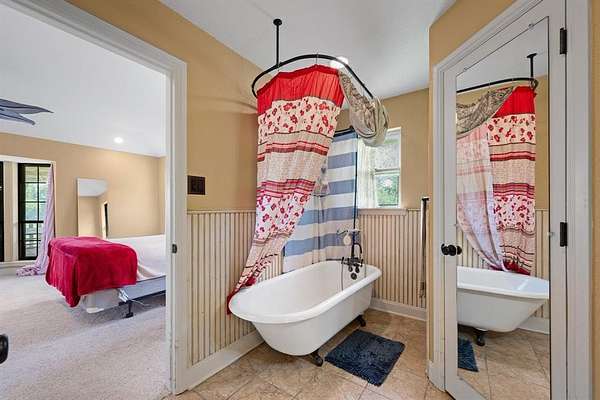 Inside, this 3-bedroom, 3-bathroom home features multiple flexible living spaces—ideal for a home office, craft room, or homeschooling setup. The living room boasts a cozy mock fireplace, while the kitchen and dining areas are accented with beautiful Saltillo tile floors. An open concept layout connects the kitchen, dining, and den, with large windows offering serene views of the surrounding landscape. The spacious primary suite includes a charming bay window and a classic antique clawfoot bathtub, adding character and comfort. This one of a kind property has served as the backdrop for numerous photography sessions a testament to its distinct charm and beauty. A huge bonus is a new septic system was just recently installed along with new carpet in the bedrooms.