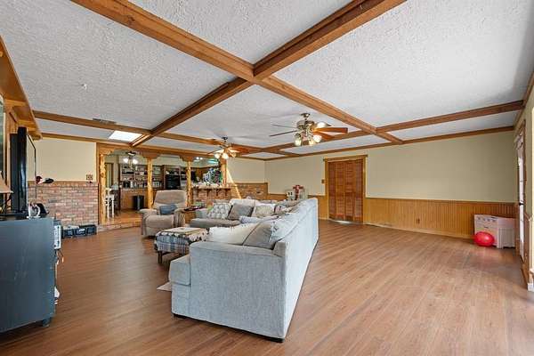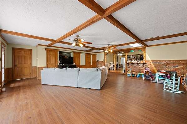 As you approach this truly unique and secluded property, you’ll be welcomed by a custom rock waterfall that enhances the peaceful ambiance of the grounds. Nestled on approximately 5 acres, the home offers exceptional privacy, with mature trees lining the front of the property and open, cleared space surrounding the residence. In addition to the main home, the property includes a detached two-car garage, a 23x15 storage building, an older barn, and a charming post-WWII structure with a full-length front porch perfect for entertaining or relaxing with guests. Step onto the expansive back deck, which spans the entire length of the home, providing an ideal setting for outdoor gatherings or simply enjoying the natural surroundings.