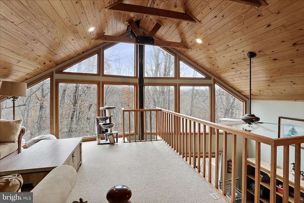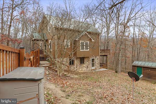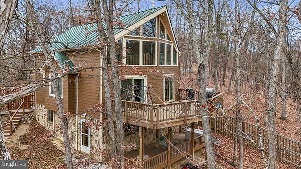 Welcome to Crossings View! This beautiful home, nestled on top of the Cacapon Mountain is more than just a cabin! Topping the ridge you are greeted with this 3 bedroom home and large 2 car garage with additional living space and bar/studio! Inside the home take in the natural light, the views, vaulted ceilings and open concept! The open concept kitchen, living room and dining room are complimented by the beautiful hardwood floors, an eat-at kitchen island with range, a main level bedroom and bath, the floor to ceiling windows in the living room overlooking the deck and yard, and the separate dining and breakfast area! Upstairs is the primary suite with a lofted living area, perfect for additional gathering space, office or personal hang out space. Onto the lower level, the third bedroom and bathroom are paired with a family room/great room and laundry room. The lower level has it's own entrance and deck as well as a gas stove and storage making a great option for an in-law suite or additional living space! Each level of this home feels like it's own personal area making it great for family trips, having guests or just enjoying your own time! As if the home doesn't offer enough space, the garage an incredible addition! This 2 car garage with front entrances has plenty of additional space as well as a bar and a gorgeous studio apartment! The studio apartment is completed with hardwood floors, a tile surround bath/shower, recessed lighting, and is prewired for a home theater! As you step back outside and take in the home and garage, you can admire the large lot, the views, and even the cedar fenced portion of the yard ( 0.5 acre), the shed and the back up generator! Whether you are looking for a forever home, a mountain escape, an investment or even a retirement home Crossings View has so much to offers! The gated community is packed with neighborhood feels, pavilions, river access for kayak & canoeing, basketball courts and plenty of common areas! Take in the peace and quiet of the woods, rivers and mountain while being close proximity to WV, VA and MD; as well as major routes and highways like 522, WV-99 and I-81! **Ask how the UTV could be yours as well