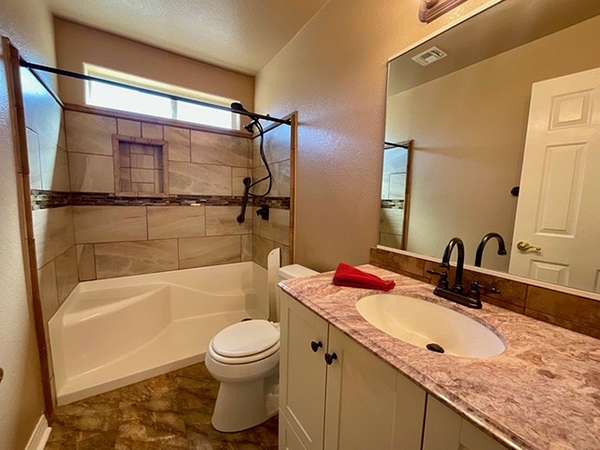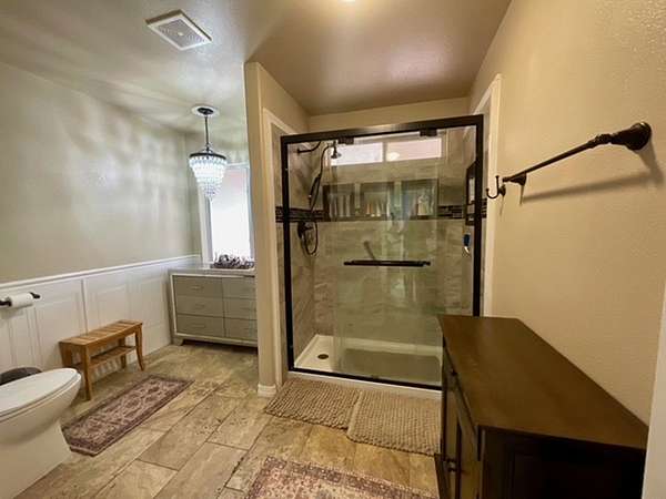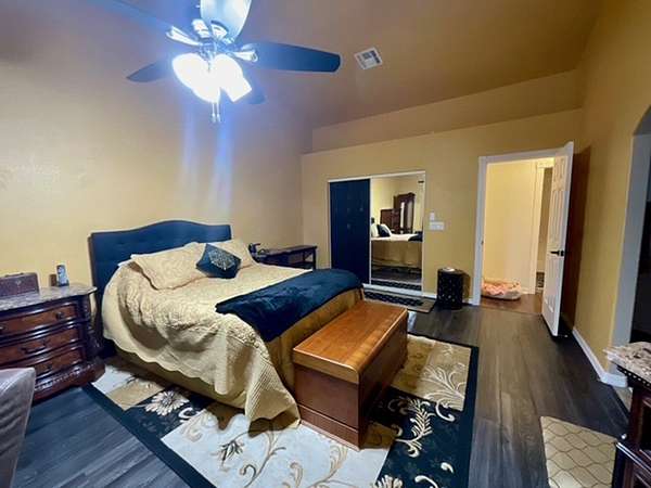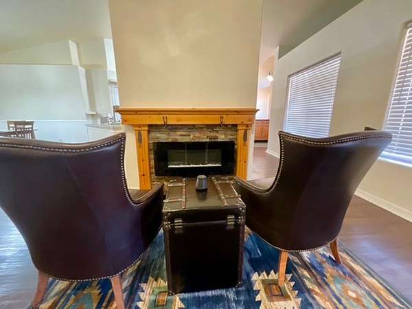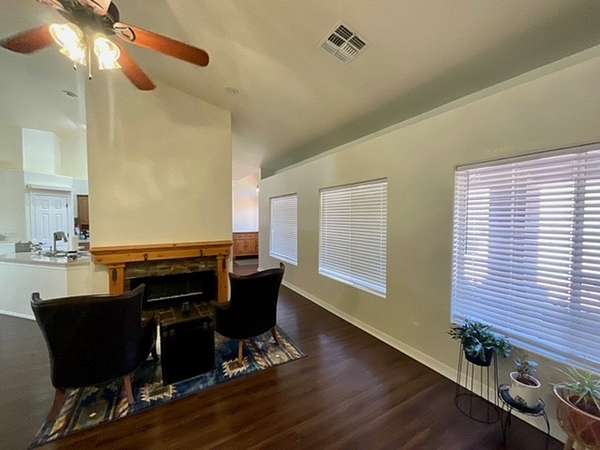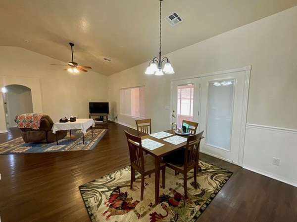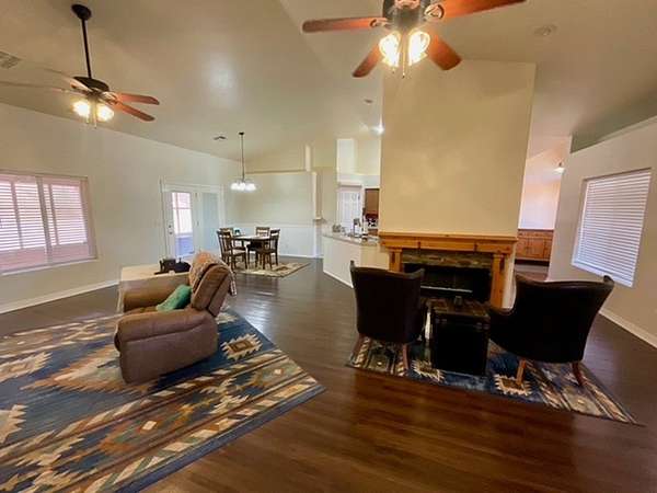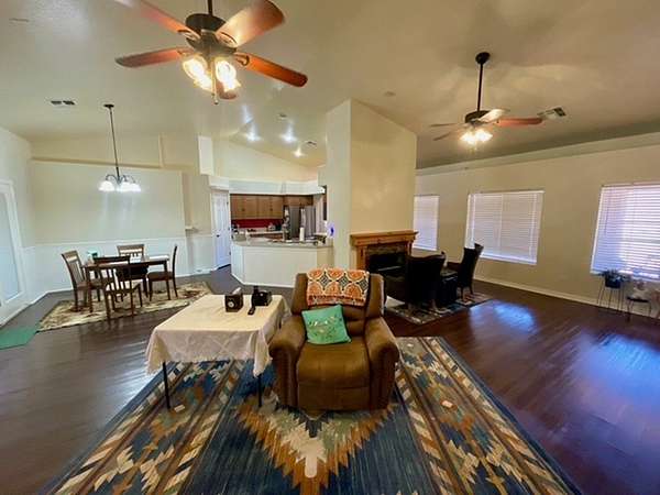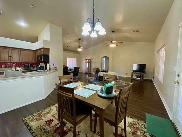 - Breakfast Bar, Ceiling Fans, Dining Area, Granite Counters, Open Floorplan, Pantry, Primary Suite, Vaulted Ceilings, Window Treatments