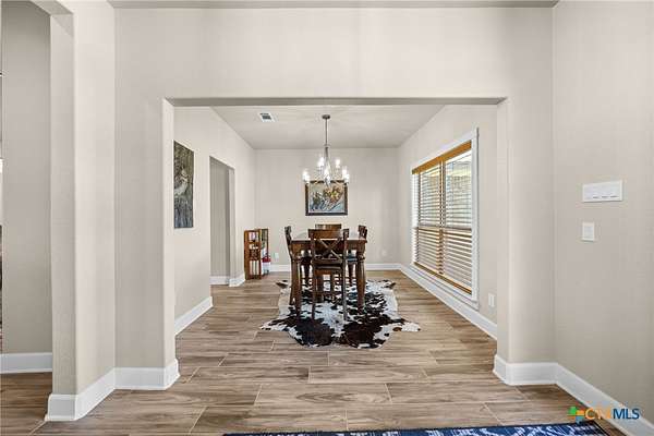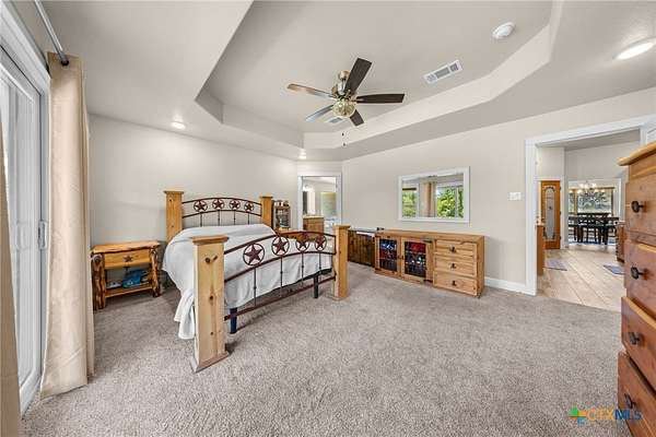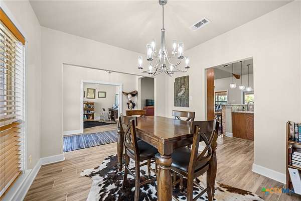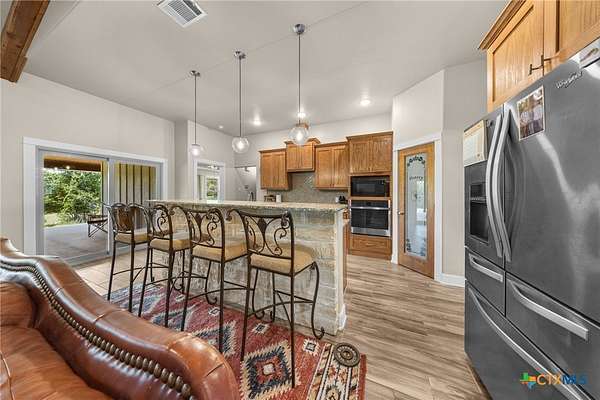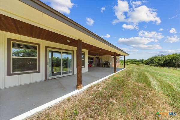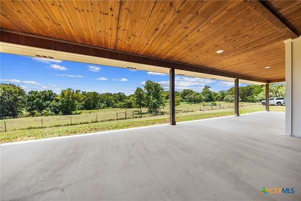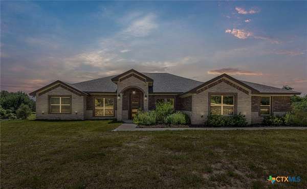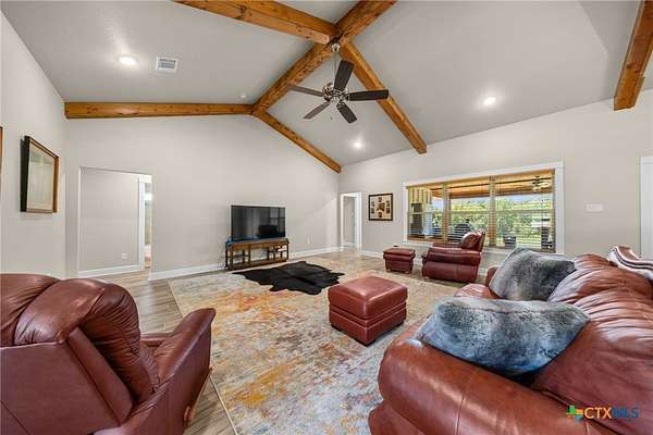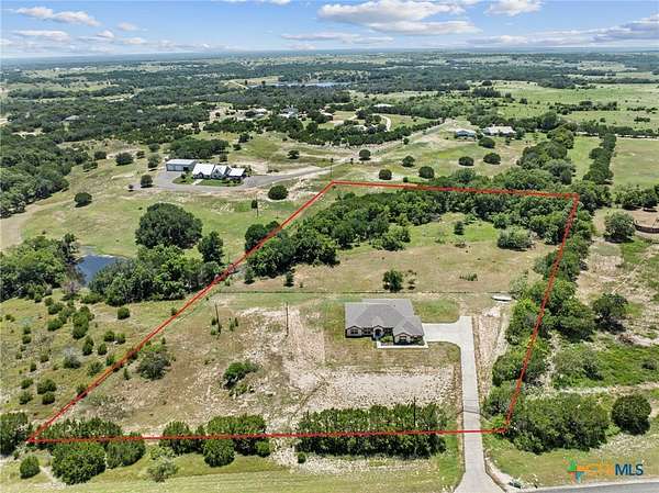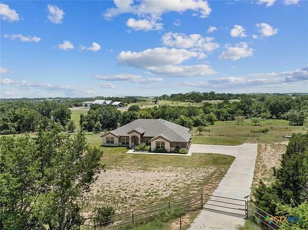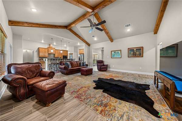 Stunning 2021 Custom Home on 4.85 Acres! This beautifully designed 4-bedroom, 3-bath home offers 2305 sq. ft. of comfortable living space with an open-concept floor plan and high-end finishes throughout. Tile flooring spans the main living areas, while plush carpet adds warmth to the bedrooms. The spacious living room features gorgeous beam-accented ceilings, creating a welcoming atmosphere for entertaining or relaxing. The gourmet kitchen is equipped with granite countertops, custom cabinetry, an eat-in bar, and a dining area just off the kitchen - perfect for gatherings. A large private office provides the ideal space for working from home. The expansive primary suite includes a luxurious en-suite bath with a walk-in shower, soaking tub, dual vanities, and a large walk-in closet. Additional highlights include a spacious laundry room, sprinkler system, and a large covered back porch with an outdoor sink - ideal for outdoor living. Situated on 4.85 acres with mature trees, a seasonal creek, and scenic views, this property offers peace, privacy, and plenty of room for animals or to add a workshop. A rare opportunity to own acreage with a nearly new custom home that blends comfort, functionality, and style.