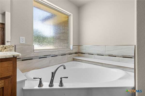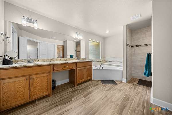 - All Bedrooms Down, Beamed Ceilings, Breakfast Bar, Built In Features, Ceiling Fans, Custom Cabinets, Double Vanity, Garden Tub Roman Tub, Granite Counters, Home Office, Kitchen Island, Living Dining Room, Open Floorplan, Pantry, Separate Shower, Shower Only, Tub Shower, Walk In Closets