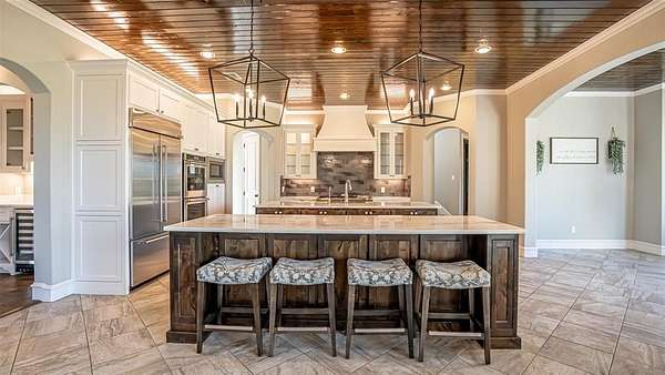 From the moment you arrive, the elegant stone and brick façade, circular drive, and manicured grounds create a striking first impression. Inside, soaring ceilings, rich hardwood floors, and walls of windows fill the open floor plan with natural light. The expansive living area is anchored by a grand fireplace and wood-beamed ceilings, flowing seamlessly into the chef’s kitchen—ideal for both daily living and entertaining.