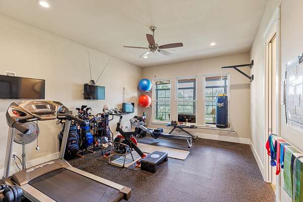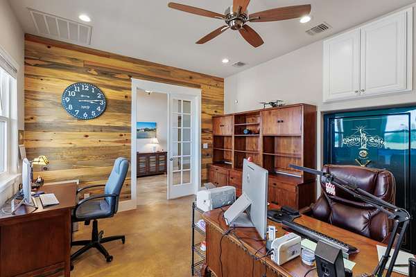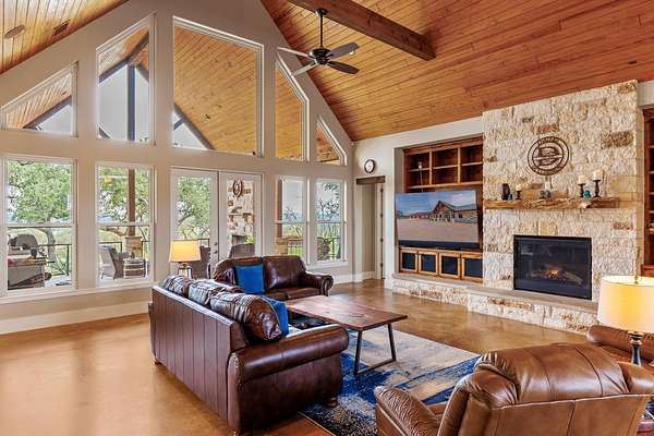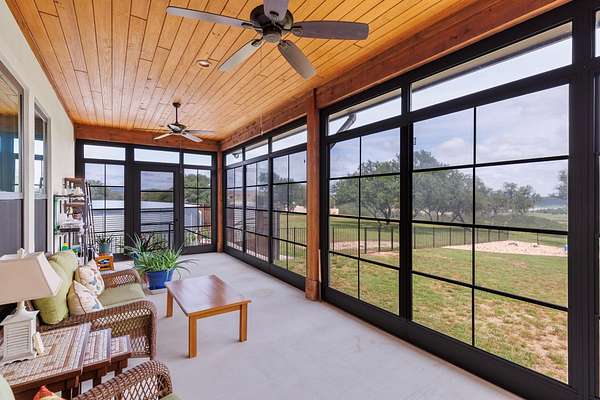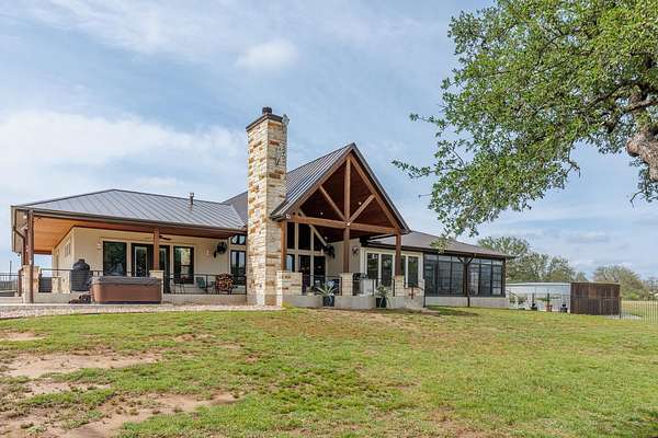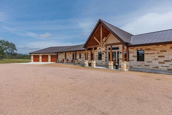 HORSES WELCOME! Custom built ranch-style home set on 5 wide open acres, featuring 3880sqft, 3 bedrooms, 3.5 baths & a 3 car attached garage is the perfect blend of spacious living with modern amenities; ideal for family gatherings and outdoor enjoyment. Imagine yourself seated on the front porch, rocking to the cool breeze. Step inside, find vaulted tongue-and-groove ceilings and exposed beams in the spacious, open living room. The fireplace and built-in cabinets showcase this stunning space with huge picture windows that overlook the covered back patio with a stone fireplace. Enjoy coffee or wine on the expansive back porch, grill steaks with a gourmet outdoor kitchen. Back inside, the chef-style kitchen features granite counter tops, wine refrigerator, ice maker, double islands, plenty of storage, a coffee bar, sleek, stainless steel appliances, all perfect for entertaining. The spacious sun-filled primary suite & ensuite bathroom create a relaxing atmosphere with the same great views. Bonus rooms include a personal gym, an enclosed sunroom, and a home office. The two guests bedrooms are versatile with so much space. Homeowners will love the whole-home generator and the rain water collection system. Want to plant a garden, there's plenty of room. This home embodies modern luxury in the Texas Hill Country. If you want to live where the cattle roam, wildflowers bloom, enjoy views of Lake Travis, have a neighborhood boat ramp, gated access, then look no further!