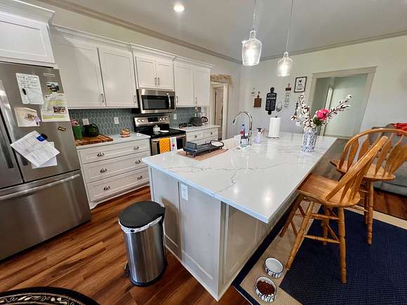A gravel driveway leads you to the heart of the property, where a charming country home awaits. Encircled by pipe fencing, this beautifully appointed residence exudes warmth and character from every angle. With over 2000 square feet of living space, this home features this home features 3 bedrooms, 2.5 bathrooms, and one of the bedrooms is currently being used as an office space.
