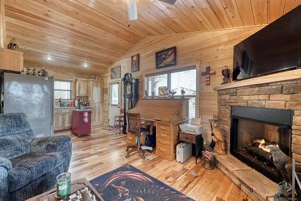 2023 Built home, minutes from town with a stunning view! All the perks of NEW without all the stress of building. Drive up to the cabin of your dreams, featuring wooden siding and a metal roof. As you step inside, you'll be greeted by wooden walls and ceilings. In the living area, a stone fireplace provides a cozy atmosphere perfect for cool summer evenings. The kitchen matches the interior of the house, showcasing wooden cabinets and polished appliances. As you walk down the hallway, you'll find the master suite, which includes a walk-in closet and a full bathroom, —a perfect way to get ready in the morning to start your day. This cabin also has an additional room with hall bathroom, which conveniently houses the washer and dryer as well! The highlight of this 2-bedroom, 2-bathroom cabin is the screened porch, ideal for keeping bugs at bay during the summer. From there, you can enjoy breathtaking views of the beautiful mountains and fluffy clouds while watching the changing colors of the trees, all with a nice cup of coffee or tea in hand. Additionally, outside, there is an outbuilding for your lawnmower and for storing tools or projects during the winter. Enjoy this house, the stunning views, and everything this cabin has to offer!