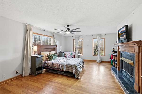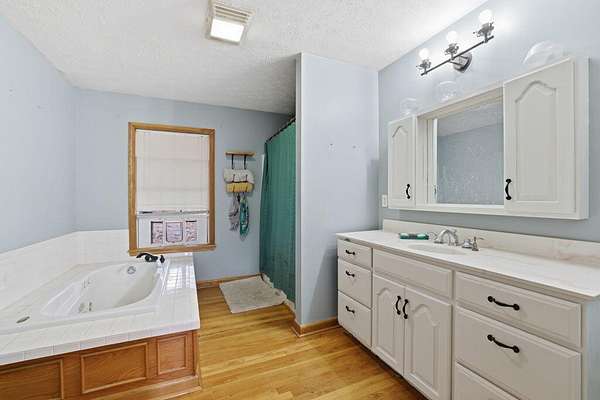 - Double Shower, En Suite, Natural Woodwork, Open Floorplan, Primary Downstairs, Separate Shower, Split Bedrooms, Tub/Shower Combo, Walk-In Closet(s)