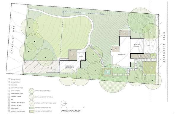 This half-acre property has a well and approvals for a 3600 sf main house on the upper pad and a garden guesthouse/home office or ADU with its own garage accessed from the private drive below. The property enjoys a private access to Yankee Point Beach, a two-minute walk from the lower edge of the property. It also fronts on a scenic easement across Spindrift Road, affording unexpected privacy. The main house captures ocean views from every room. Three levels are organized around a central stair culminating on the top living level with panoramic and white water views. High windows bring in light and nature, and terraces at each level extend the outdoor enjoyment of this multi-faceted setting. The combination of views and beach access, coupled with distinctive contemporary architecture by award-winning architect, Frank Hennessy, make this property unique. For those wanting a custom home in one of the most desirable neighborhoods on the Monterey Peninsula, this property has all planning and coastal approvals in place and is ready to be adapted and finished to suit.