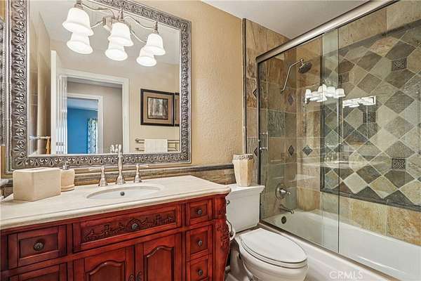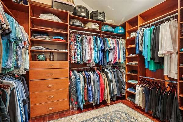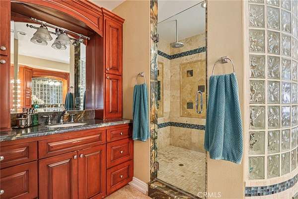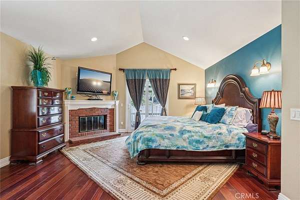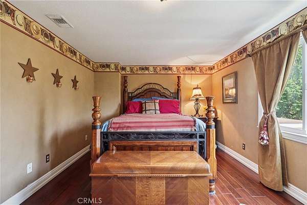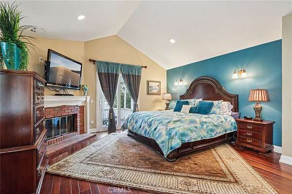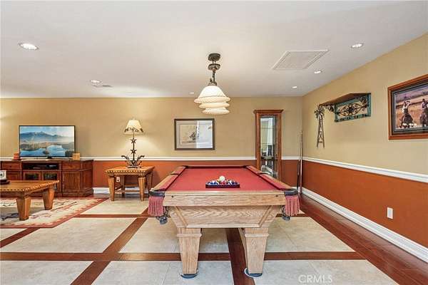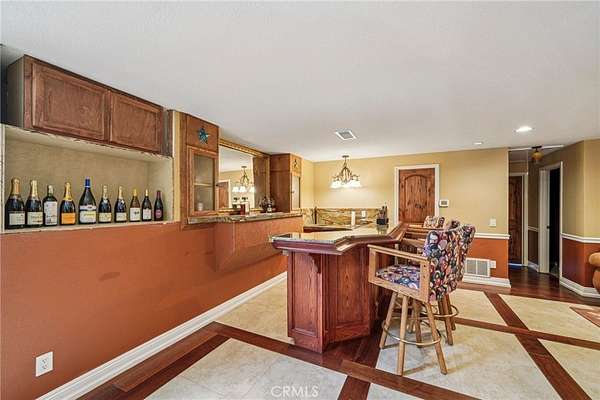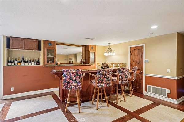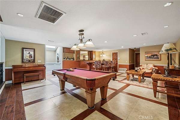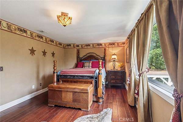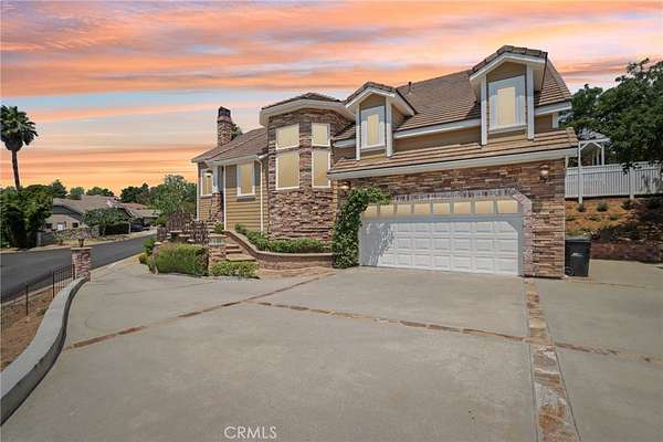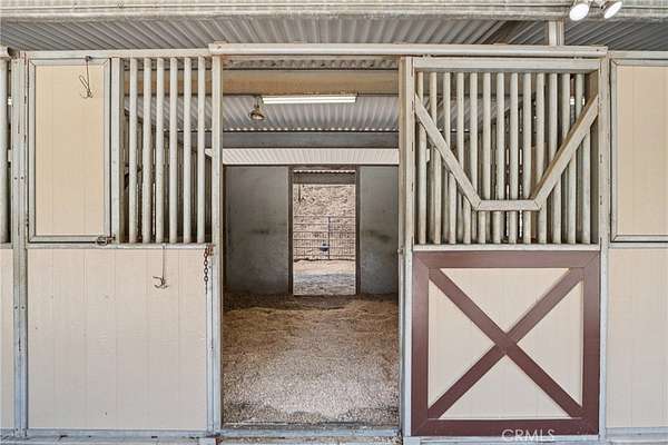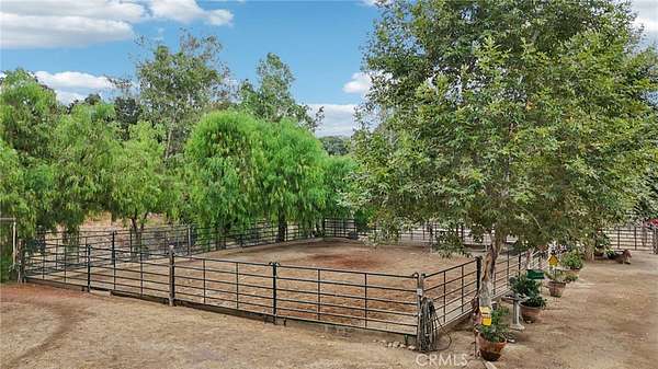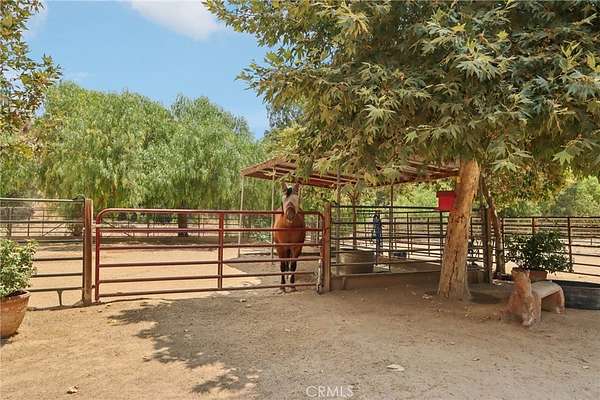 The heart of the home is a dream kitchen outfitted with high-end Thermador appliances, including a stove with a warming drawer, double ovens, & oversized built-in refrigerator. Rich cherry wood cabinetry, granite counter tops, a walk-in pantry, & an oversized island with bar seating make it the ultimate gathering space. The adjoining great room with 22' ceiling, fireplace & a sun-drenched breakfast nook creates a warm, open atmosphere perfect for everyday living and entertaining. Upstairs offers more space to unwind, featuring a custom bar, game room, additional bedroom, and full bath. Down the hall past the dining room & powder room, is the private primary suite that boasts a fireplace, sliding doors to a secluded patio, a spa-like bathroom with oversized shower, Jacuzzi tub, and an expansive walk-in closet. Two additional bedrooms and a hallway bath complete the main sleeping quarters. Step outside and down the slope to a thoughtfully designed 6-stall barn, complete with a large 16x24 stall currently used as a workshop, stall mats, fly system, ventilation, feeders, tack room, hay storage, wash rack, & a bathroom with washer/dryer hookups. The riding arena is spacious with room to expand, multiple shady turnouts offer the horses comfort & a variable- speed hot walker is located at the edge of the horse area. All landscaping is on a drip system for year-round beauty. Additional highlights include custom iron & brick fencing around the entire estate, plentiful trailer parking & a dump station. This is a prime location just minutes from the 210/57/10 freeways, Ontario Airport, Cal Poly Pomona & the Claremont Colleges. This rare equestrian sanctuary is the perfect blend of rural charm & urban accessibility--schedule your private tour today!