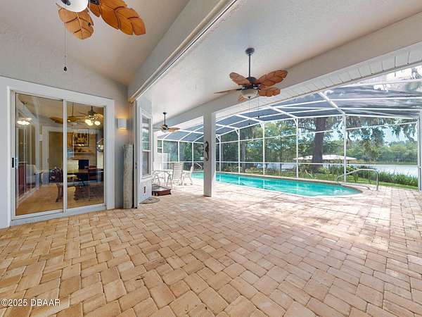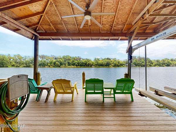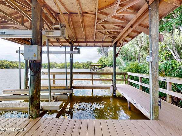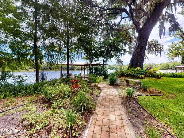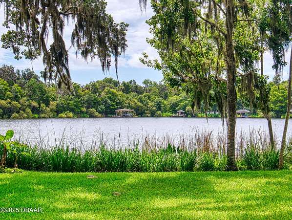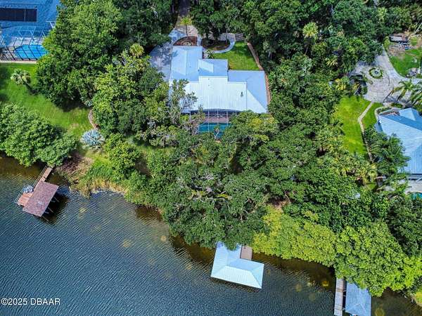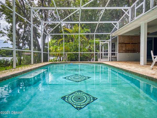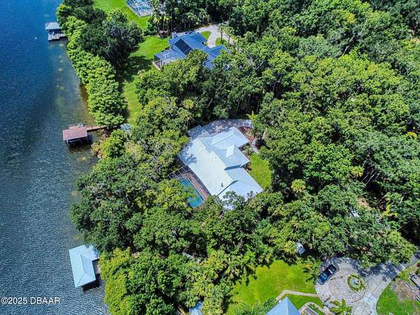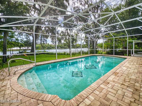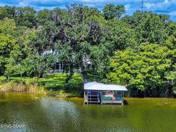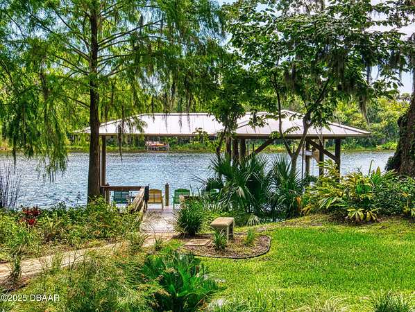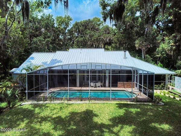 Beautiful 4 bedroom, 3 and a half bath, lakefront, pool home located in the highly desired gated community of Lake Waterford Estates in New Smyrna Beach. Lake Waterford is a 75 acre, spring fed lake perfect for boating, skiing, fishing and a number of other water sports. This spacious home sits on a 1.75 acre lot which is lush with a variety of mature trees, fruit trees and beautiful flora. Enter this home through the welcoming foyer where the eye is immediately drawn to the serene view of the tranquil lake in your own backyard. This home was designed for entertaining with a distinguished formal dining room and formal living room. The large primary bedroom, with expansive windows, letting in the beautiful views and two individual walk-in closets, will be a welcomed retreat at the end of the day. The ensuite bath comes equipped with double sinks, separate shower and a jetted garden tub. The 3 spacious guestrooms, each with ample closet space and natural light streaming through the windows, are comfortable and inviting. The hub of this amazing home is the open-concept, family room, dining nook and kitchen. This kitchen is a chef's dream with granite counter tops, stainless-steel appliances, gas stove and plenty of storage space. The kitchen opens to a dining nook and family room. As you enter the family room you are drawn to the massive natural stone fireplace. Exit the family room through custom, stained-glass french doors to your sparkling, screened-in pool and classic pavered patio deck. Sit and enjoy your morning coffee as you take in the beauty of life on the lake. Just beyond the pool is a pavered walkway that will lead you down to the boat-house and dock. This durable dock, made of WEARDECK material, is equipped with electricity, water and newer boat lift. What better way to end the day than with a relaxing boat ride or simply sitting on your own dock enjoying the beauty of nature in this breathtaking setting. Other outstanding features of this exquisite home: indoor laundry room with full bath, oversized 3-car garage, whole home diesel-powered generator, outdoor storage sheds, circular driveway, central vacuum system, custom stained-glass lighting and doors, high ceilings and plantation shutters. NEW METAL ROOF 2024. Air Conditioners, Refrigerator and Hot Water Heater new in 2024. The Lake Waterford Estates community amenities include a clubhouse, tennis courts and boat ramp. This sprawling, exquisite home offers the best of Florida living. This property is conveniently located less than 10 miles to the sandy beaches of New Smyrna and about an hour to the Orlando airport. Call today to schedule an appointment to see this truly spectacular and unique home.