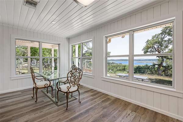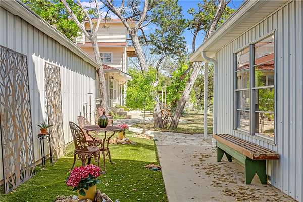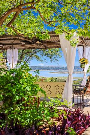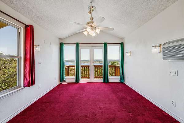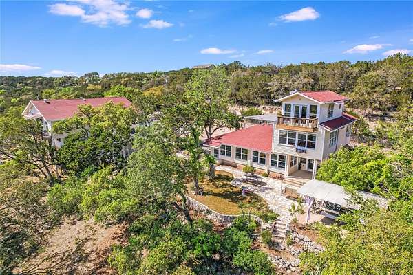 Nestled in the heart of Lake Travis and the Texas Hill Country, this 1.99 acre estate offers stunning south-facing lake and Hill Country views. The three fenced tracts include two structures with four self-contained dwellings, each featuring separate entrances, bedrooms, bathrooms, kitchens, and living areas. The newer 2,350 sq ft structure, built in 2010, includes a three-bedroom, two-bath apartment, an oversized one-car garage, and a 770 sq ft bonus living space with its own entrance, bedroom, full bath, and kitchen. The main house was expanded in 1996 to 2,363 sq ft and includes a dining area, full bath, laundry niche, and apartment on the second and third floors. The original one-level home built in 1959 was 1,085 sq ft with a kitchen, bedroom, bath, and porch. Three outbuildings include a garden shed, 12' x 19' Morgan Building, and a workshop. Parking includes a single-car garage and five carport spaces, including one with 12 ft clearance for RV parking. The driveway provides extensive parking and extends to the final tract, which includes two RV sites with water and electric hookups. The property features fruit trees, mature oaks, cedar and pecan trees, flowering greenery, and a peaceful natural setting. Deeded beach access is a short drive away. The current OSSF is grandfathered and has operated reliably for decades; however, Travis County requires replacement upon transfer. The seller has researched multiple replacement options and system designs with estimated costs available for buyer review, allowing flexibility for future use of the property.