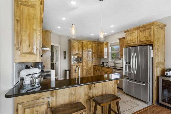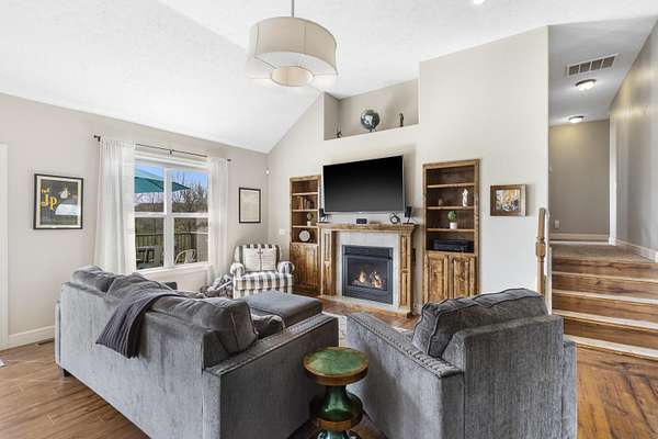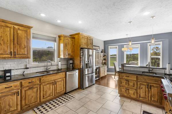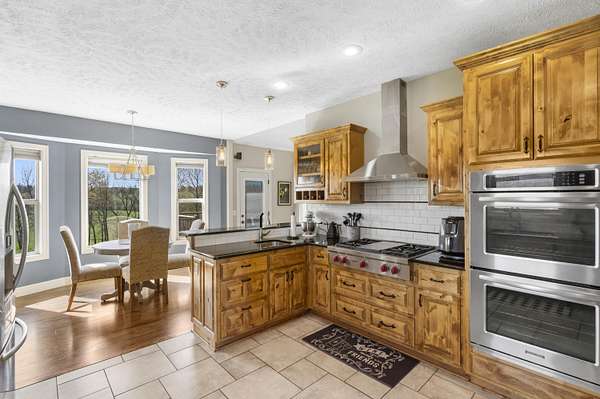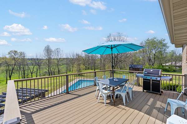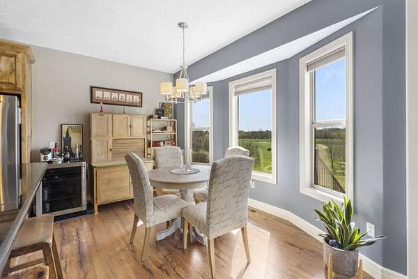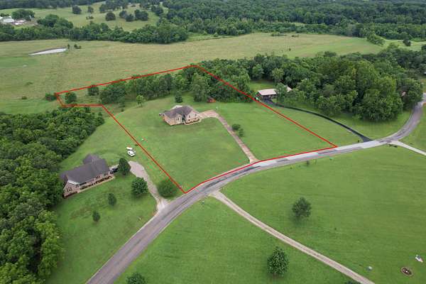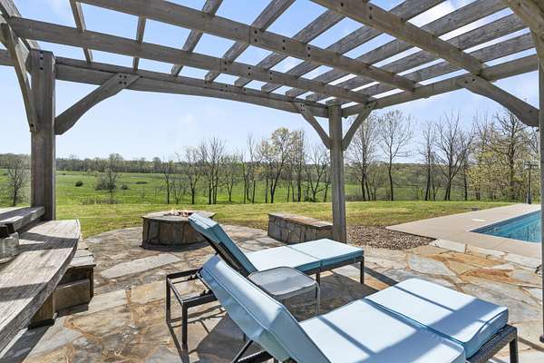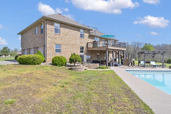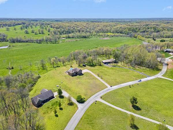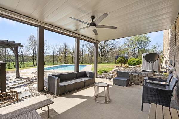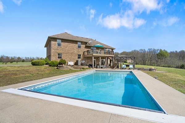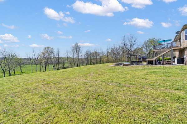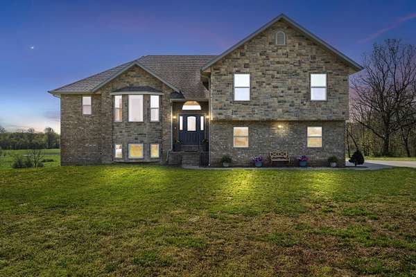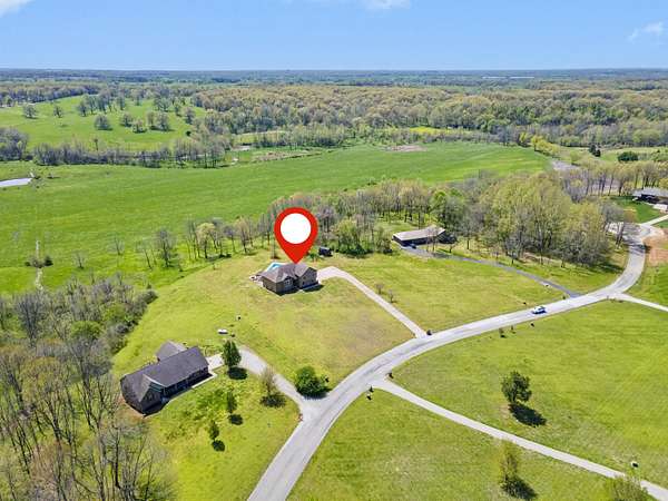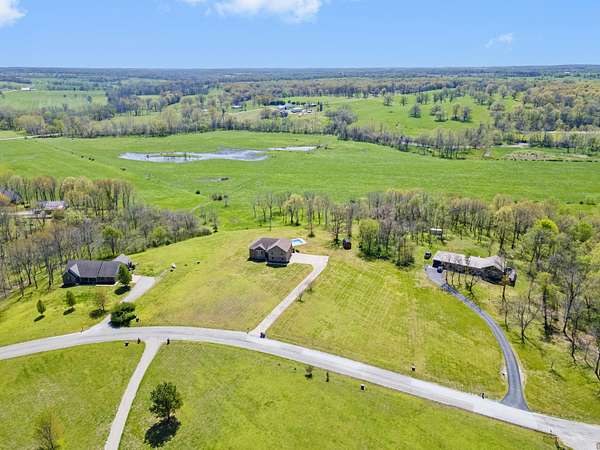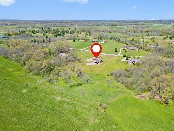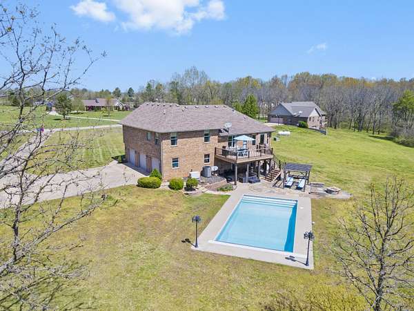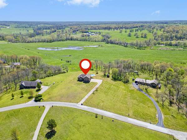 Stunning all-brick & stone home on 5.1 acres near Aurora, Missouri's Honey Creek Golf Course. Enjoy breathtaking countryside views, a saltwater pool, wildlife sightings, and luxury living throughout. This custom 4 bed, 3.5 bath home features a gourmet kitchen with Wolf appliances, hardwood floors, high ceilings, and a spa-like primary suite with heated marble floors & walk-in closet. The walk-out basement includes a second living space, a soundproof studio, and more. Heated 3-car garage with built-in bar, TimberTech deck, firepit patio, whole-house generator & top-tier finishes throughout. This home offers breathtaking panoramic countryside views. From vibrant sunrises and sunsets to frequent visits from deer, turkey, and other wildlife, the setting provides a peaceful, private retreat. An in-ground saltwater pool with an automatic cover adds the perfect touch for both relaxation and family fun. Custom-built in 2012 by renowned builder Bill Michel, this home reflects superior craftsmanship and timeless design. Inside, rich hardwood floors, soaring ceilings, and two cozy gas fireplaces create a warm and elegant atmosphere. The formal dining room includes a built-in China hutch and bookcase, making it ideal for hosting or everyday use. The chef's kitchen is a true standout, featuring custom Alder cabinetry, granite countertops, and top-tier stainless-steel appliances including a Wolf gas cooktop with griddle, double ovens, built-in microwave, and refrigerator. With a double sink and a second prep sink, the space is as functional as it is beautiful. A spacious breakfast nook with breakfast bar leads directly to the maintenance-free Timber Tech deck--perfect for outdoor dining and entertaining. Call today for your private showing. This home & property will not disappoint!