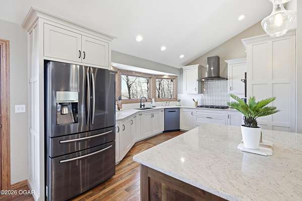 - Dishwasher, Disposal, Gas Cooktop Built-In, Microwave Built-In, Refrigerator, Vent Hood, Wall Oven, Wine Cooler