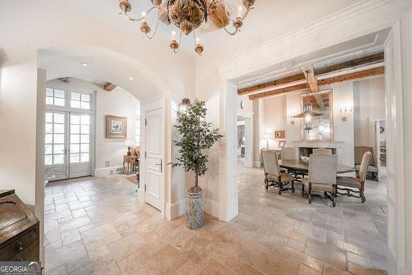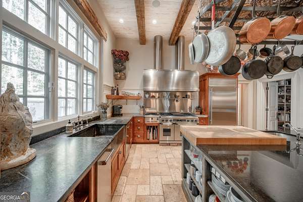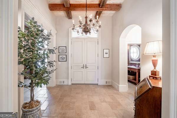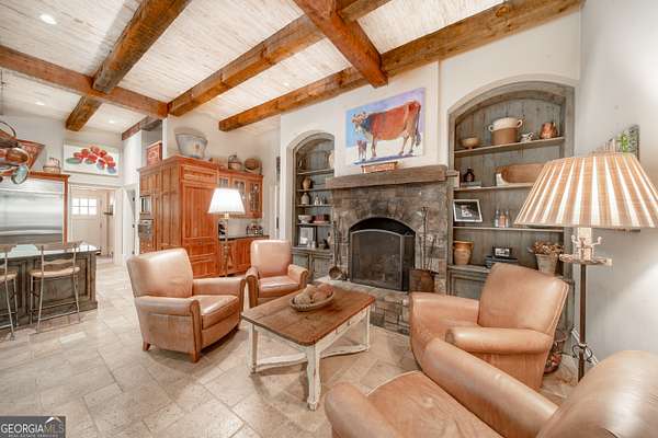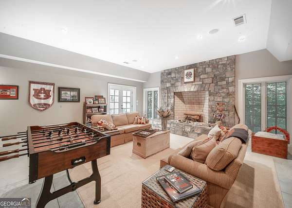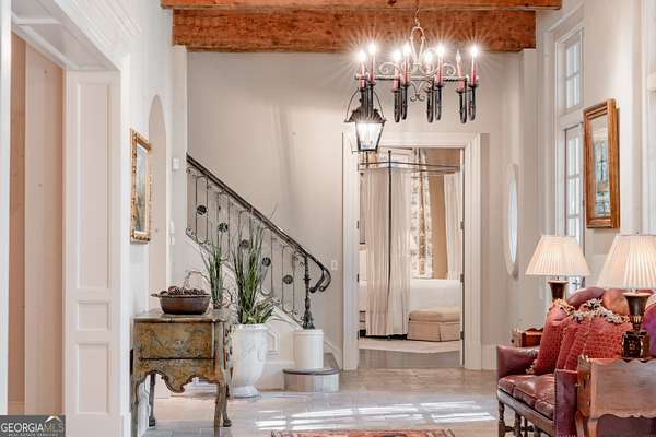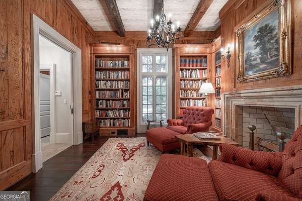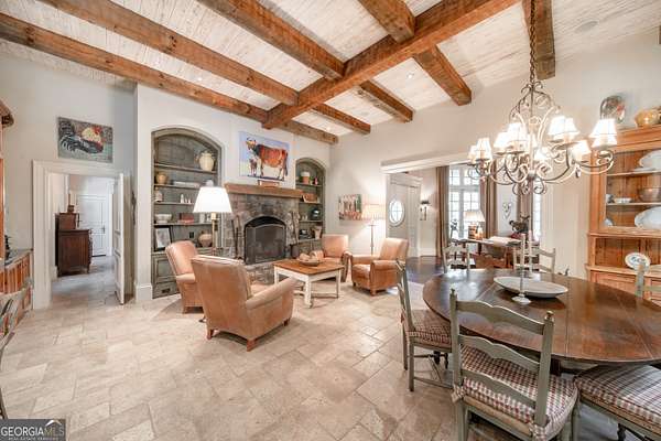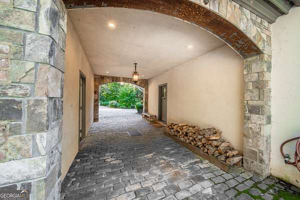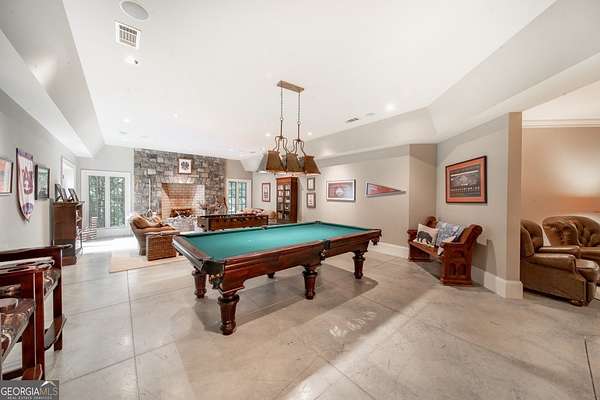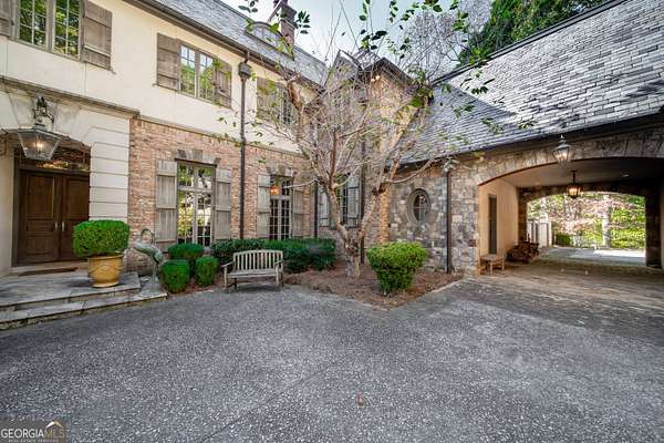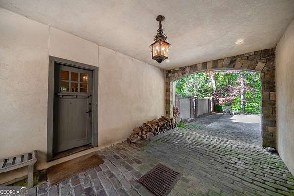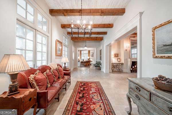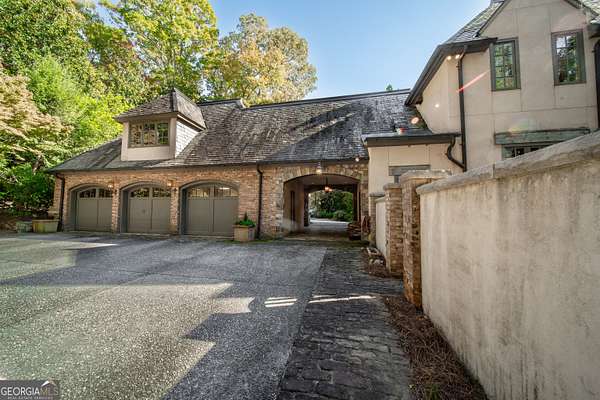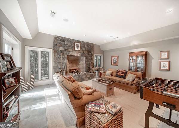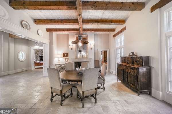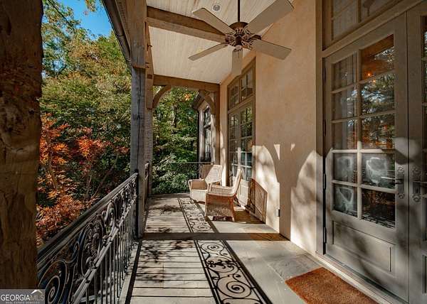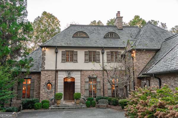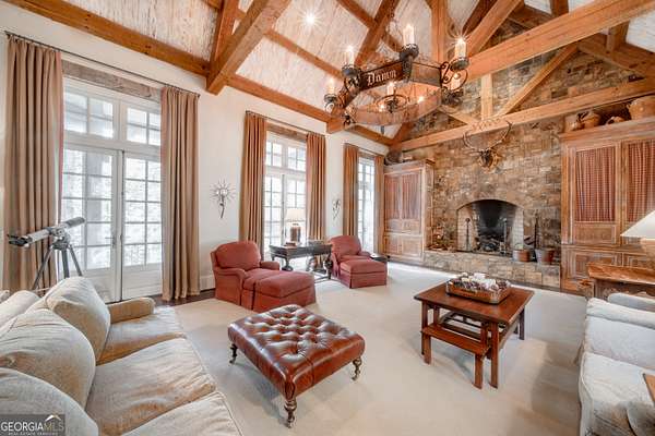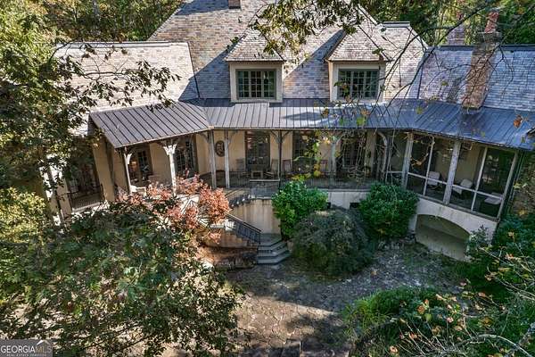 Welcome to Corbett Manor, an extraordinary 112-acre estate where refined luxury and natural beauty exist in perfect harmony. Just five minutes from downtown Clarkesville, this remarkable property offers an elevated lifestyle surrounded by private hardwood forests and impeccably maintained grounds. The stately exterior showcases timeless craftsmanship with a sophisticated blend of stone, brick, and hard-coat stucco, complemented by a slate roof and copper gutters. Through grand mahogany doors, the foyer welcomes you with Italian limestone flooring and soaring 13-foot ceilings. Limestone tile and rich heart pine floors flow throughout the main level, while floor-to-ceiling custom windows flood the home with natural light. A Lutron lighting system enhances both ambiance and ease of living. At the heart of the home, the chef's kitchen is designed for both beauty and performance, featuring commercial-grade appliances including dual Sub-Zero refrigerators and freezers, custom heart pine cabinetry, a DACOR dual-fuel range with double ovens, stainless steel hood, and a Gaggenau pizza oven. Granite and butcher-block countertops, an oversized island with prep sink, two dishwashers, and a limestone farmhouse sink complete the space. Adjacent, a cozy sitting area with heated floors, fireplace, and wet bar invites relaxed gatherings. The kitchen and dining area, seating ten overlook the private "secret garden"-a manicured courtyard with fountain, potting room, and built-in grill ideal for entertaining and alfresco dining. The primary suite is a serene retreat featuring a sitting area with fireplace and imported French marble mantel, a spa-inspired bath with heated floors, Jacuzzi tub, steam shower, custom dual-sided walk-in closet, and a private screened balcony. Just beyond, the library offers wormy chestnut paneling and a cozy fireplace. The second level hosts four spacious bedrooms, each with en-suite baths and walk-in closets. A Juliet balcony overlooks the Great Room with custom wood beams and soaring 26-foot vaulted ceilings. This level also includes a craft room and a private bedroom with bonus space and separate access above the three-car garage ideal for guests or a live-in nanny. Designed for entertaining, the terrace level features a game room with billiards, dry bar, fireplace, home theater, fitness room, and full bath, along with a generously sized laundry room, mudroom, and direct access to the property's dog run. Outdoor living spaces include a screened porch with bluestone flooring, expansive rear balcony, and courtyard cooking area, while imported antique French iron railings add old-world charm throughout. Additional features include a walk-in pantry, custom cabinetry, upgraded security system, abundant storage, and a beautifully gated entry. Corbett Manor is a rare sanctuary of timeless elegance, comfort, and thoughtful design offering an unparalleled luxury lifestyle in a truly remarkable setting.