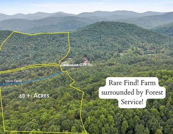Old Homestead Land in Suches, Georgia! This 60 acre tract is the kind of property that hardly ever comes available anymore bordered on three sides by thousands of acres of National Forest and sitting in one of the most untouched areas of the North Georgia mountains. If you know Suches, you already understand. If you don't, Suches sits right between Blue Ridge, Dahlonega, and Blairsville, yet somehow stayed out of the way of all three. You can be in town in a short scenic drive, but once you're on this land you feel a long way from anywhere. Atlanta is about an hour and a half south, but it feels like another world. This was once a mountain farm homestead and you can still see it in the lay of the land. Old farm roads travel through the property, open meadows break between big hardwoods, and water is everywhere. Seven branches, including babbling Davis Creek, wind across the tract. Cavender Gap Road, a paved county road, runs through the property providing easy year-round access. The terrain is gentle for mountain ground and much of it could be reclaimed into rolling pasture again. With the water, usable ground, and sun exposure, the property would lend itself well to a small farm, vineyard, winery, or other agribusiness. Outdoor recreation surrounds you. The Cooper Creek Scenic Area and its old-growth forest are within walking distance. The Toccoa River and Cooper Creek are minutes away for trout fishing and kayaking, and the hiking opportunities into the Chattahoochee National Forest are nearly endless. Whether someone wants a private mountain retreat, a family legacy property, or a working mountain farm, this is the type of tract that is getting harder and harder to find in North Georgia.