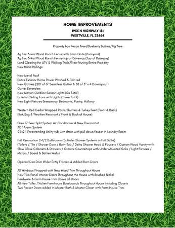 PRICED TO SELL at 25K BELOW appraised value!! Step into country charm with this beautifully renovated 3 bedroom/2.5 bath brick ranch on 15+ acres in Westville, FL! Nearly 3,000 sq. ft. of thoughtfully updated living spaces including a chef's dream gourmet kitchen with ample counter space, a walk-in pantry, breakfast nook and formal dining room. The expansive living room is a true centerpiece, offering both comfort and versatility. A stunning pine tongue-and-groove ceiling adds warmth and character, while rustic barn doors give the option to transform the room into an additional space-perfect for entertaining, a media room, or a cozy home office. The owner's suite offers a walk-in closet and a beautifully tiled shower, creating a comfortable haven. The expansive laundry/utility room provides exceptional space for storage and everyday convenience, while a glassed-in breezeway connects the home and garage, adding function and charm. Thoughtful updates include new flooring, fixtures, and energy-efficient Anderson windows, along with the durability of a metal roof and the security of a whole-house generator. Outdoors, you'll find a metal outbuilding, a 2-car garage, and a 2-car awning, offering abundant storage and workspace. With over 15 acres of cleared and wooded land, including trails for walking, horseback riding, or ATVs, this property is ideal for a hobby farm, gardening, or simply enjoying wide-open country views from the covered porches. Set back on a paved road close to town, that offers both privacy and convenience in a move-in-ready home. Endless possibilities await!