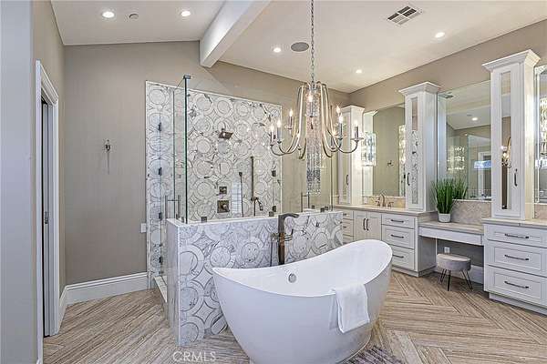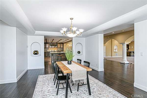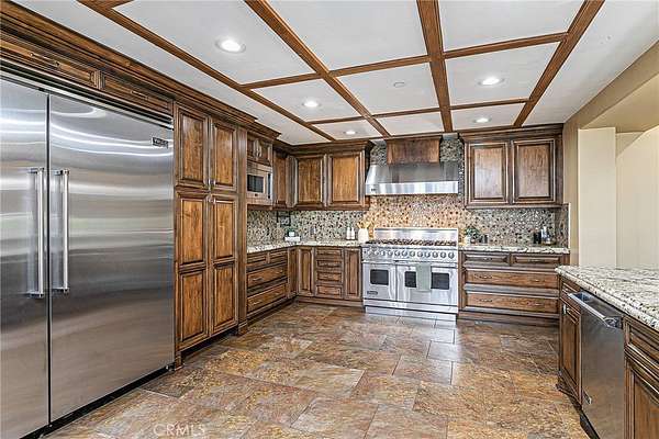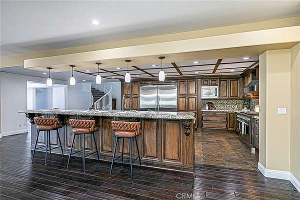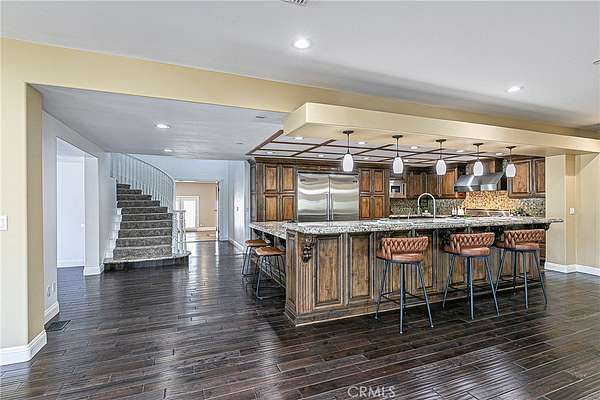 The impressive 8,100+ sq ft two-story residence features 6 bedrooms and 7 bathrooms, designed to capture natural light with travertine and hardwood flooring, granite countertops, and a striking stone fireplace. Multiple living and entertaining areas flow seamlessly to the outdoors.