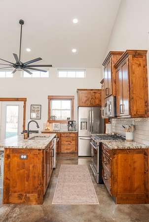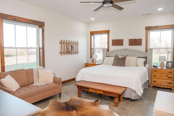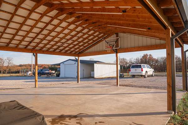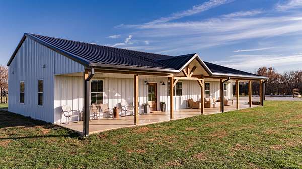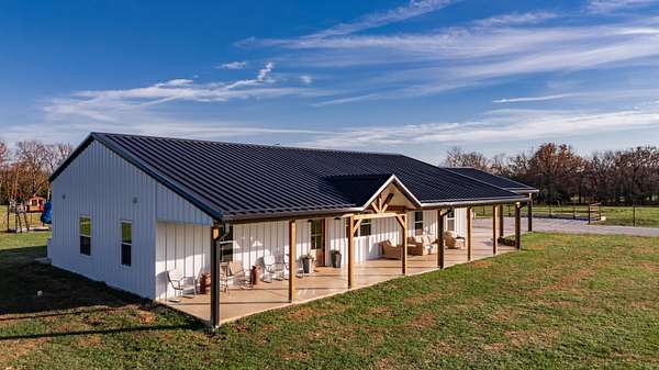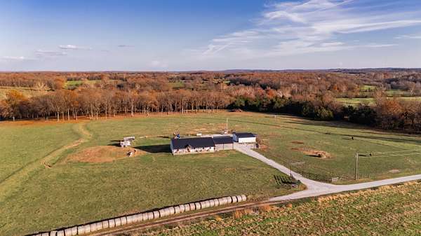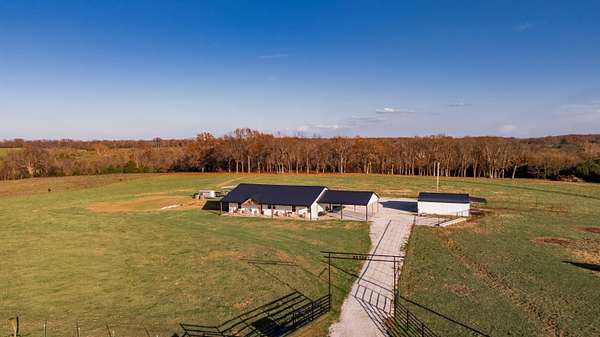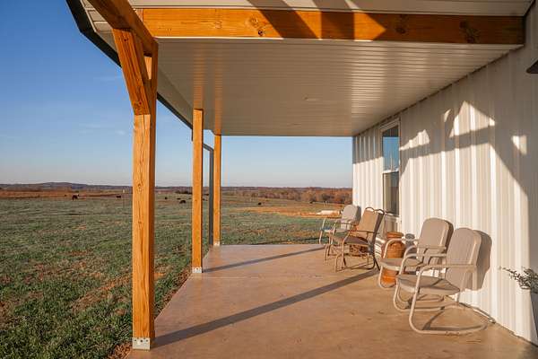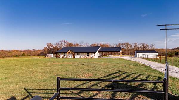 Built in 2022, this red-iron shouse sits on 20 acres of quiet Missouri ground with long views in every direction. The layout is thoughtful from the start, a split-bedroom design, clean lines, and built-ins throughout. Light fills the main living area, and the radiant-heated concrete floors keep the home warm through winter. If you've ever wanted to sit on warm leather at the end of a long day and let the quiet settle in, this ground gives you that.The kitchen stands out with river-bottom veining leathered granite, quality stainless steel appliances, and a simple, functional workflow. Both full bathrooms have double sinks and cultured-marble surrounds with jetted tubs, and the water closet near the entry makes guest use easy. Mudroom and large attic give convenient access to utilities, and the home includes a full water filtration and softener system.Step out onto the covered front porch and watch the sunsets roll across the property. Out back, the yard is set up for kids with a custom play set. The shop/garage has lean-tos on both sides, and the carport is fully concreted. The land itself is the real draw, open, usable, and ready for cattle or livestock, with a spring-fed creek tracing the east side. Private drive on a dead-end county road.Clean, well-maintained, and built with intention. A solid piece of ground for anyone wanting a real hobby-farm lifestyle without giving up modern comfort.