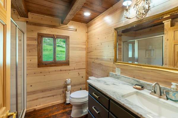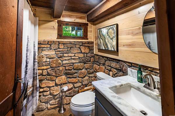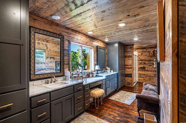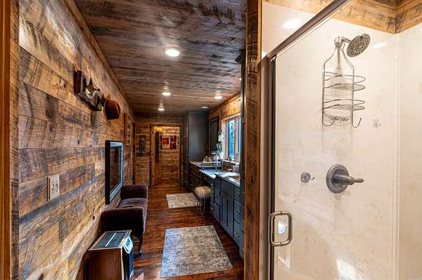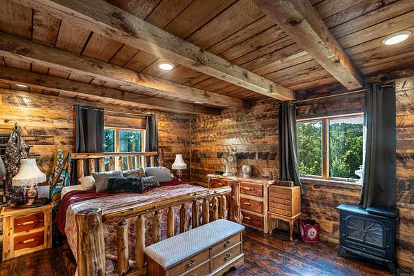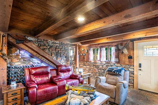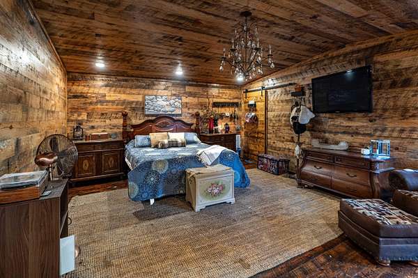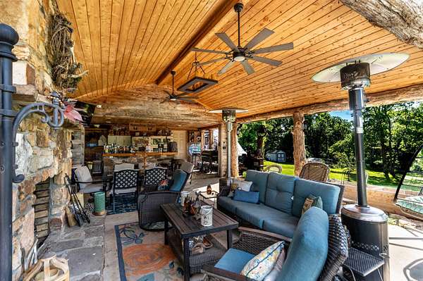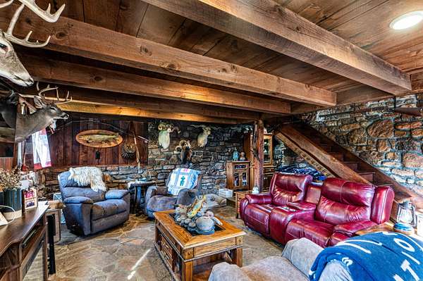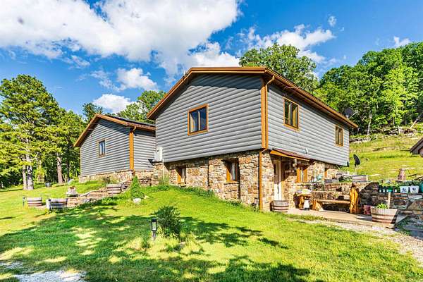 Nearly 125 acres of privacy, natural beauty, and off-grid potential await. This one-of-a-kind retreat features a spacious 3 bed, 3 bath home (approx. 2,500 sqft) with beautiful wood interiors and a restored original stone foundation from the property's earliest build. The main level includes a cozy living area, full bath, and kitchen with warm, rustic charm. Upstairs you'll find three bedrooms and two full baths, including a massive primary suite that spans over half the upper level. Don't miss out on the built-in storage throughout the primary bath! Enjoy the expansive outdoor living space with a large stone fireplace and bar--perfect for relaxing or hosting gatherings. A detached garage/workshop sits just steps away. The land is ideal for outdoor enthusiasts, with wildlife/game feeders, abundant deer and turkey, and multiple hunting stands--including 2 large enclosed stands. A freshwater spring runs year-round, with a second seasonal spring in the bluff. Solar-wired home with whole-home generator, 1,000-gal. buried propane tank, deep well, custom chicken coop, fruit trees/orchard, and a 1-mile private drive complete this private haven.