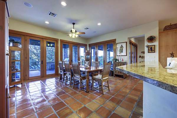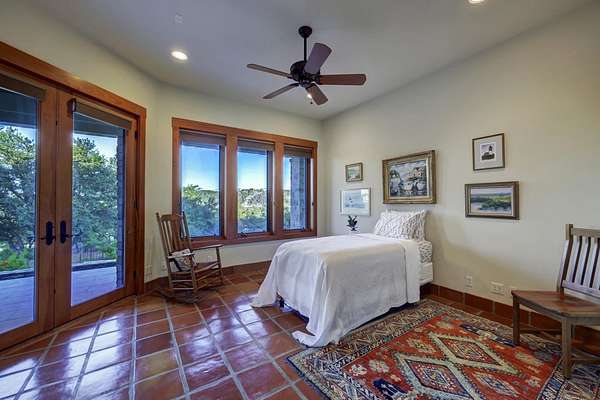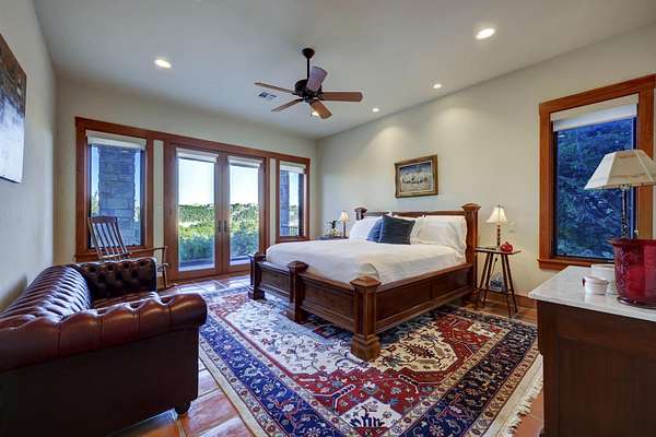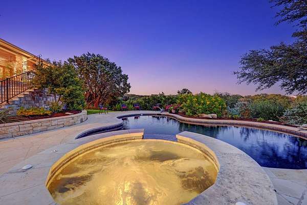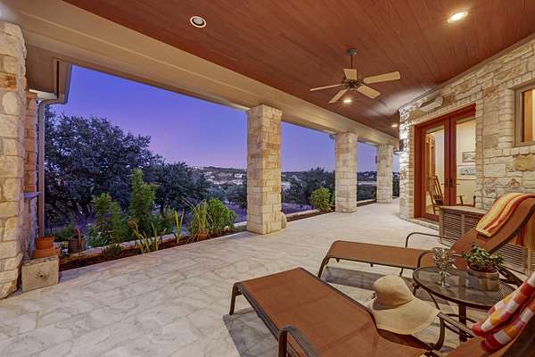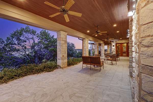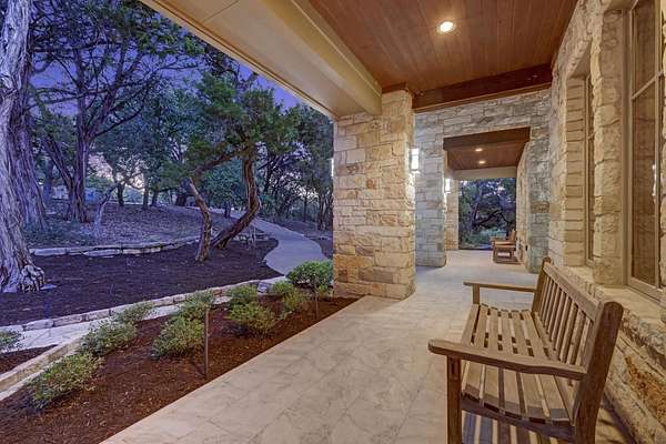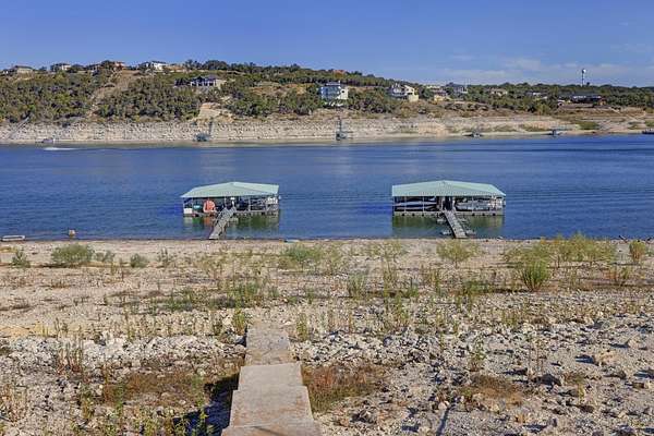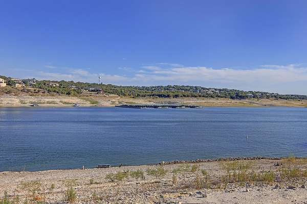 Striking one owner, single level, custom built waterfront estate located in Travis County. Breathtaking views on 6+ acres, overlooks deep water Lake Travis, as well as vistas of tranquil spaces. The 15+ acre community park and marina are located next to and below this estate, offering undeveloped neighboring land for your enjoyment at this once in a lifetime restful residential resort. The Hill Country Ranch architecture has been constructed with the finest in design and materials. The covered front porch allows one to enjoy the landscapes and wildlife. The spacious family room open to the gourmet kitchen is adorned with a floor to ceiling fireplace, wet bar, and wood-beamed ceiling. There is a lovely primary suite with fireplace, verandah access, soaking tub, separate shower, and 2 walk in closets. A second primary suite and 2 additional en-suite bedrooms are located on the opposite side of the home. Ease of indoor/outdoor living! The rear yard includes a verandah of approx. 1,600 square feet, outdoor kitchen, sparkling pool and spa, and expansive grounds. Other features include pecan cabinetry and built ins, cherry wood millwork, Saltillo tile, custom stonework, mesquite flooring, 3-zone HVAC, security system, metal roof, and huge garage with storage room. Access to a community water supply, private well, and access to Lake Travis water, community tennis/pickle ball court, a gazebo and barbecue area and marina with 18 slips. Lake Travis ISD. A boat slip is available for separate negotiation.