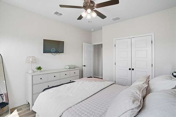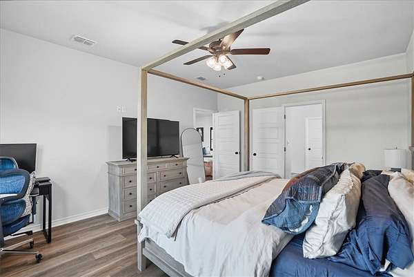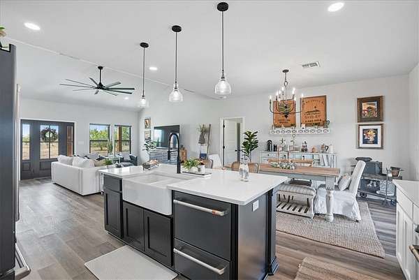 - Breakfast Bar, Ceiling Fans, Kitchen Island, Open Floorplan, Primary Downstairs, Split Bedrooms, Window Treatments