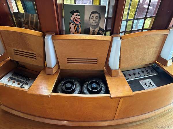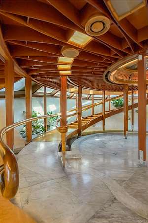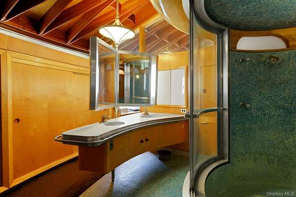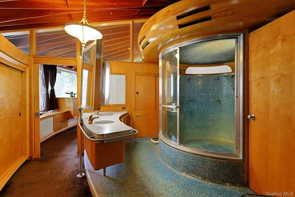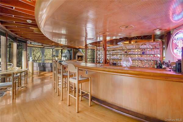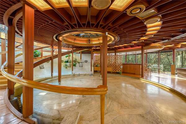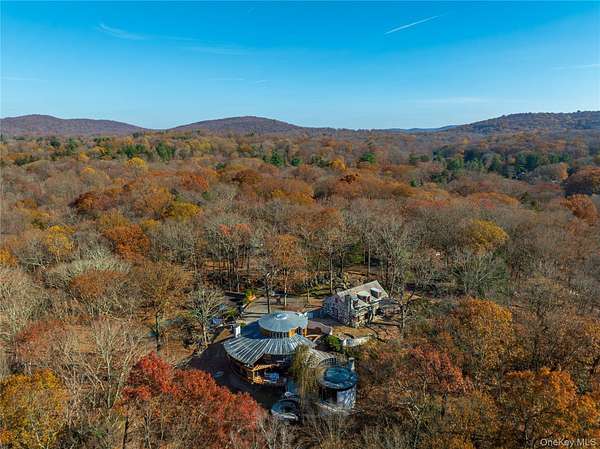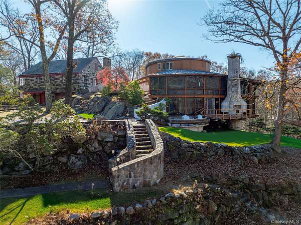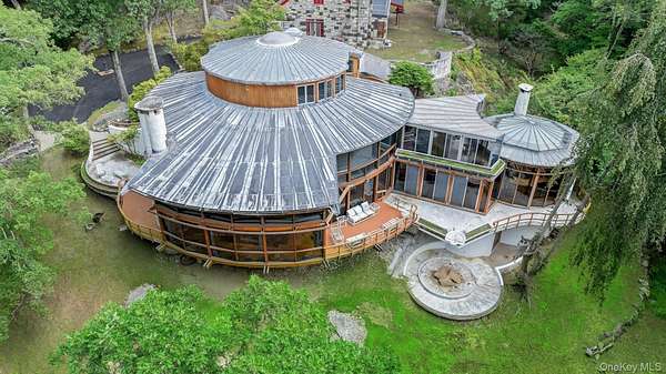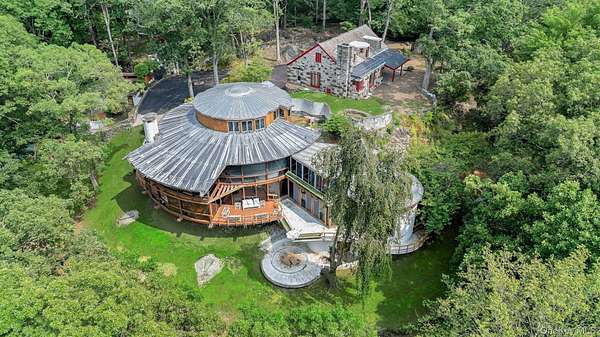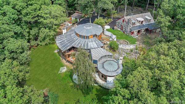 Off-the-Charts Cool, Cool, Cool. This Mid Century Modern architectural masterpiece is tucked away on 8.6 Hudson Valley acres, blending seamlessly with nature through floor-to-ceiling windows. About one hour north of NYC in Westchester County, "The Mothership" Roundhouse is a stunning MCM structure designed and built by Robert Cika under the commission of American Icon Jackie Gleason who was fascinated by UFO's. Completed in 1959, the home was under construction for 5 years. A second "Spaceship" is a smaller structure that has been used as a bunk-house and glamping over the years. It is as if Spaceships have landed in the woods of Westchester! The detailed, extraordinary craftsmanship is evident in the woodworking, almost entirely bent, a process which is a time-consuming art. A Scandanavian shipbuilder was commissioned to create the ceiling design which resembles the shape of boats while the metal work is also incredible - some vents resemble stylized fish. Floors and fireplaces are made of Italian marble. (Gleason was said to have purchased an entire marble quarry in Italy to ensure the ability to import enough quality marble!) There is much folklore that surrounds this property too - if the walls could talk. Gleason's celebrity guests are fabled to have included Frank Sinatra, Marilyn Monroe, Joe DiMaggio and Nixon for his midnight soirees. With the original swooping Bars (3), a Game Room (with official Shuffleboard table) and the glamorous Marble Dance Floor, this home was imagined for entertaining. Yet "The Mothership" is also relaxing and one enjoys beautiful views and a harmonious connection with Nature provided by the floor-to ceiling windows. Other features: Three Bedrooms, two Full baths, one Half Bath, Stainless Steel Curved Kitchen, spacious Livingroom Area, Dining Room, circular Library and Office. It is remarkable that many original details and numerous built-in cabinetry and closets have been preserved. Additionally, "The Barracks," a 1930's Stone Colonial House is charming and can serve as a guest house. Plus, lovingly cultivated and fully fenced expansive vegetable and herb garden with gardening shed. An exceptional private country estate retreat, this property is a hidden gem. Close to championship Golf Courses, the Hudson River, West Point, Dining, Shopping, Music and Metro North Train Stations for convenience. Simply put, "How sweet it is."
