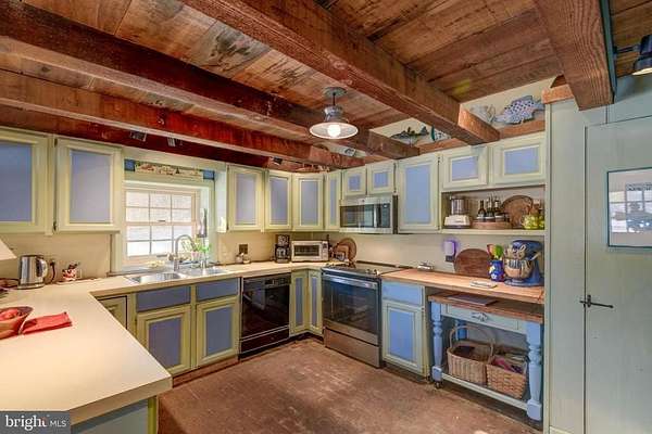 - Breakfast Area, Ceiling Fan(s), Country Kitchen, Exposed Beams, Skylight(s), Stall Shower Bathroom