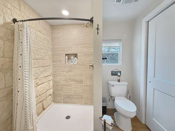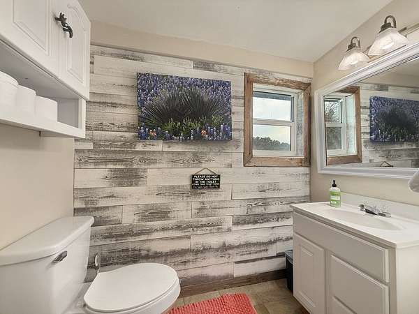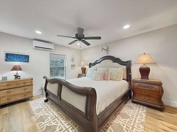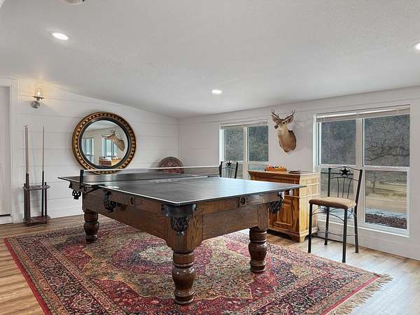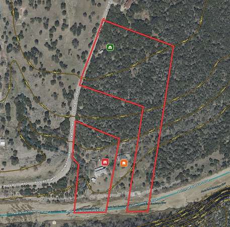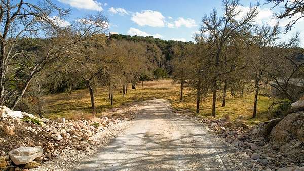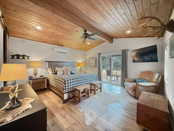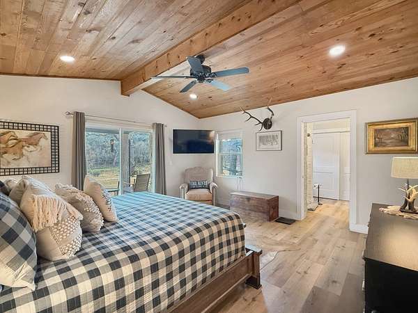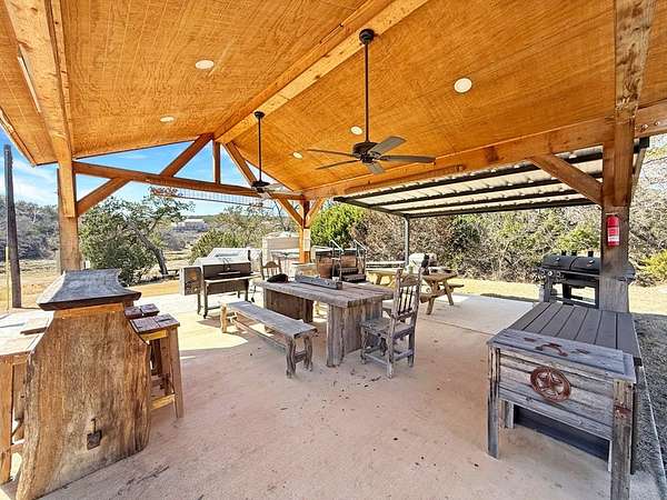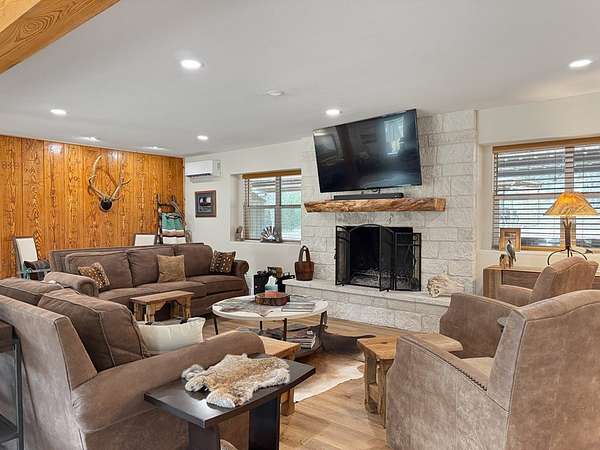 Behind a custom ranch gate on the North Fork of the Guadalupe River, this extensively renovated Hill Country retreat neighbors the legendary MO Ranch and sits beneath an 80-foot limestone bluff. Rebuilt in 2020 with new PEX plumbing, mini-split HVAC, and LED lighting, the home sleeps 16 with capacity for 24 - ideal as a family compound, second home, or turnkey short-term rental. The open-concept main level features a quartzite-island kitchen, dining for ten, a live-edge pecan wood bar, and a limestone-fireplace great room flowing to a sprawling backyard with fire pit patio, timber-frame outdoor kitchen, and direct river access. The master suite offers vaulted wood ceilings, dual vessel sinks, and private deck access. Upstairs, a bunk room and game room with pool table, foosball, and shuffleboard keep groups entertained, along with a nine-person hot tub. Multiple parcels with mature live oaks, wildlife feeders, a covered chuck wagon, UV-filtered well with 3,000-gallon storage, and multiple storage sheds complete the property. Minutes from Hunt, Ingram, and Kerrville - yet a world away behind the gate.