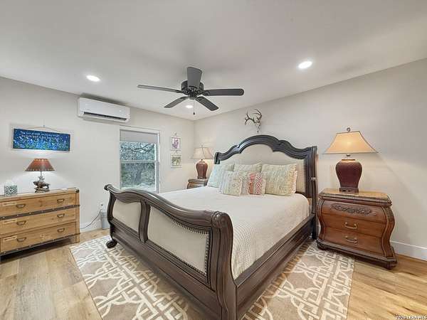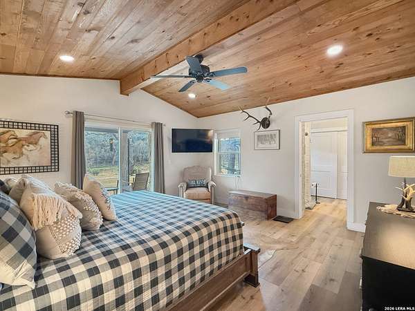 Your Own Private Stretch of the Guadalupe Tucked behind a custom iron ranch gate on Rock Bottom Road, this extensively renovated Hill Country retreat delivers the rare combination of riverfront living, generous acreage, and a home built to gather - whether that means family weekends, corporate retreats, or a thriving short-term rental operation. Neighboring the legendary MO Ranch and framed by an 80-foot limestone bluff rising from the North Fork of the Guadalupe River, this is the kind of property people drive the Hill Country hoping to find. The main residence is a two-story, stone-and-metal-roof home that was taken down to the studs and thoughtfully rebuilt in 2020 with modern infrastructure - new PEX plumbing, mini-split HVAC throughout, and LED lighting - while preserving the authentic Texas character that makes it special. Wood paneling in the great room wall with historic cattle ranch brands, a floor-to-ceiling limestone fireplace, live-edge bar tops, and hand-selected western furnishings give the interiors a warmth and identity that no new build can replicate. The open-concept kitchen, dining, and living area is designed for large groups. A massive quartzite-topped island anchors the kitchen, surrounded by white shaker cabinetry, subway tile backsplash, open wood shelving, and stainless appliances. The adjacent dining room seats ten comfortably at a trestle table, with additional bar seating at a stunning live-edge pecan slab counter. Beyond, the great room offers plush seating around the stone fireplace with a mounted TV with sound sound and wood mantel - the perfect spot after a day on the river. Step through 16' sliding glass doors to discover the property's true magic: a sweeping backyard that rolls gently down to your own stretch of the Guadalupe. A concrete patio with Adirondack chairs surrounds a steel fire pit, and a timber-frame pavilion houses an outdoor kitchen with multiple grills, ceiling fans, and room to host a proper Texas barbecue. Views from here take in the river bottom, the dramatic rock bluff across the water, and nothing but open sky and Hill Country canopy beyond. The home sleeps 16 as configured, with the potential to accommodate 24. The master suite features vaulted wood-plank ceilings, a king bed, sliding door access to a private deck, a leather recliner, and a spa-style bath with dual vessel sinks on a cypress wood vanity set against an interior limestone wall. A second king bedroom offers similarly refined finishes with its own patio access. The expansive upstairs bunk room - with multiple bunk beds, a full bed, a daybed, and an adjoining game room - is a dream for families or groups. The game room delivers with a pool table, foosball, shuffleboard, mounted deer, shiplap walls, and its own sitting area. A nine-person hot tub, purchased in 2021 and regularly serviced, rounds out the entertainment offerings. Additional spaces include a western-themed sitting room with Hill Country art and a horse saddle display, a secondary living area with sectional sofa, a coffee bar nook, and a charming powder room with a reclaimed cypress wood longhorn vanity and hammered copper sink. Every bathroom has been updated with tile showers, quality fixtures, and thoughtful details. The property spans along Rock Bottom Road with mature live oak groves, a wildlife feeder, and a covered chuck wagon near the river - a nod to the ranching heritage of the area. A well with UV filtration system and 3,000-gallon storage tank ensures reliable water. A storage shed and ample parking handle the practical side of hosting. Located minutes from Hunt, Ingram, and Kerrville, you're close to wineries, outfitters, and the vibrant culture of the Hill Country - yet behind that ranch gate, you could be a hundred miles from anywhere. Whether you're seeking a legacy family compound, a turnkey vacation rental, or simply a place where the river is your backyard and the stars are your ceiling, Rock Bottom delivers.