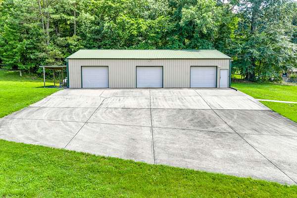 Impressive 40x60 detached 3-bay garage with separate entry and covered lean-to--ideal for equipment, vehicles, or lake toys.