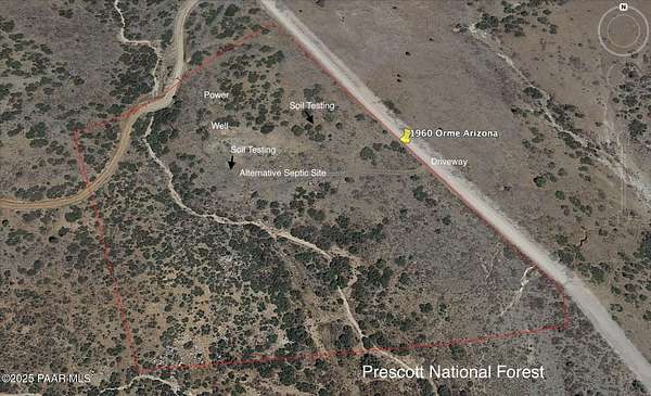 7 ACRES WITH WELL, SOILS TESTS, SEPTIC DESIGN! Discover this exceptional property bordering the scenic Prescott National Forest, just a short 15-minute drive from Prescott Valley. Experience breathtaking views and endless development potential on this remarkable land. Approved building sites with completed alternative septic system design and acres of flat buildable land pave the way for your construction plans. The serviced 180-foot PVC-lined well ensures a reliable 6 gallons per minute flow rate. 120/240 single phase electricity is readily available at property line. Super easy access via county-maintained road, ensuring a smooth journey to your dream investment. All necessary documentation is available for review.