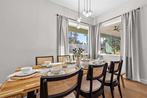 - Ceiling Fans(s), Eat-In Kitchen, High Ceilings, In Wall Pest System, Kitchen/Family Room Combo, Open Floorplan, Primary Bedroom Main Floor, Solid Surface Counters, Solid Wood Cabinets, Split Bedroom, Thermostat, Walk-In Closet(s), Window Treatments