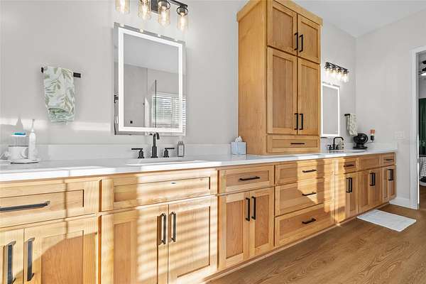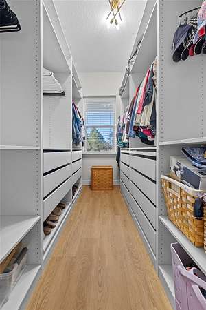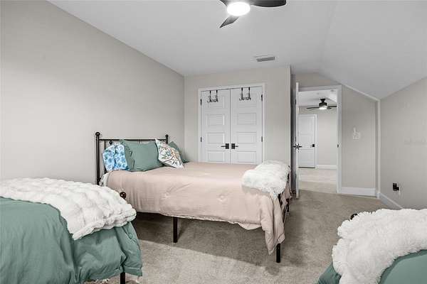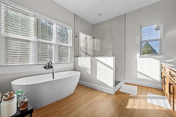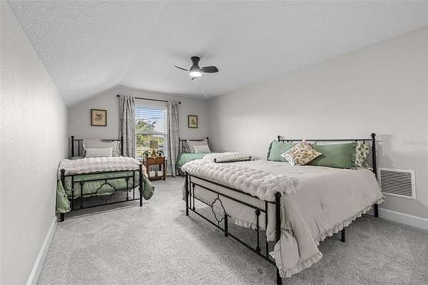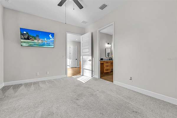 This 5-bed, 4-full-bath, 2-half-bath home (expandable to 7 beds) has luxury vinyl flooring main areas (carpet in beds). The oversized primary suite includes dual vanities, standalone tub, double shower, tiled walls, water closet, 7x5-ft shower, 8x10-ft walk-in closet, fan, and TV. Additional bedrooms include king-sized potential, walk-ins, and Jack-and-Jill baths.
