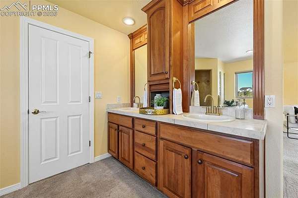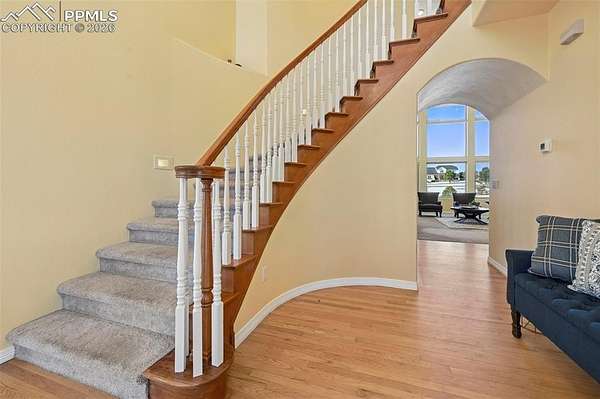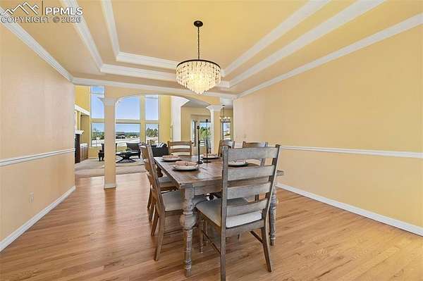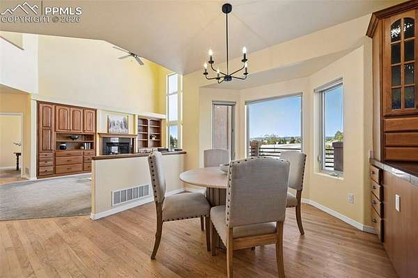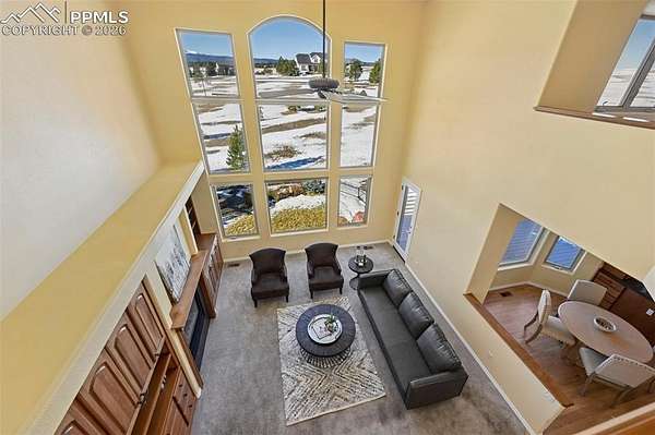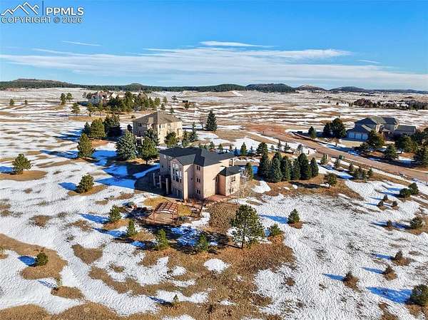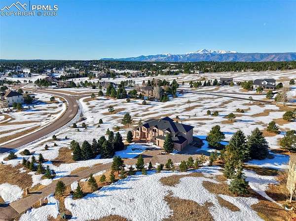 Tucked away on a quiet cul de sac in the sought after King's Deer community, this impressive custom home offers space, privacy, and stunning views of Pikes Peak and the Front Range. Set on 2.5 acres surrounded by mature pines and blue spruce, the property provides a peaceful Colorado setting while still being conveniently located to Monument, Colorado Springs, and Denver. The home welcomes you with an elegant entry and sweeping staircase that opens to a dramatic two story great room that is light, bright and airy with it's soaring ceilings. A warm and inviting fireplace and built in cabinetry create the perfect gathering space for relaxing or entertaining. The kitchen is thoughtfully designed with granite countertops, double ovens, a gas cooktop, generous cabinetry, and a sunny breakfast nook that overlooks the beautiful backyard. The main level offers excellent versatility with a private study, a formal dining room with architectural details, and an additional living space that can easily function as a second office, sitting room, or library. A convenient mudroom and laundry area add everyday practicality. Upstairs, the spacious primary suite serves as a peaceful retreat featuring its own fireplace, a comfortable sitting area, and sweeping mountain views. The luxurious five piece bath includes a soaking tub, separate shower, and a large walk in closet. Additional bedrooms and a loft area provide plenty of room for family, guests, or flexible living space. The walkout lower level expands the home even further with a large recreation and media area, additional bedrooms, and a full bath, making it ideal for guests, extended family, or multi generational living. Step outside to enjoy Colorado living at its best with a large composite deck,a beautifully landscaped and fenced lawn, and a paver patio complete with a craftsman pergola and fire pit that is perfect for outdoor gatherings or quiet evenings under the stars.