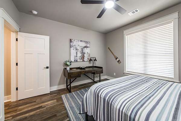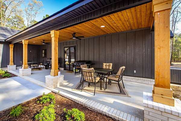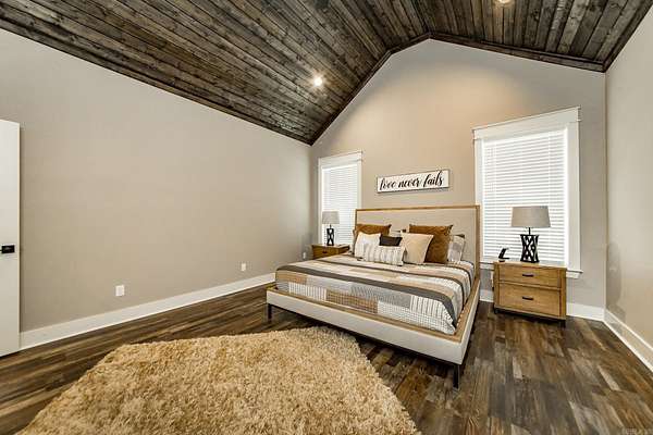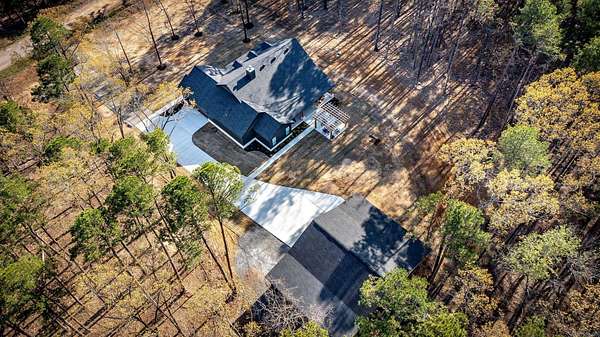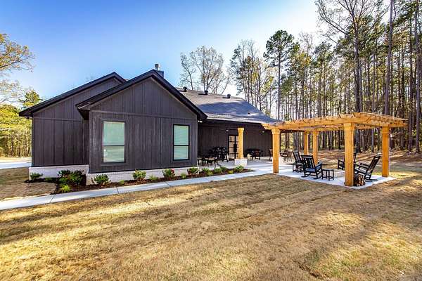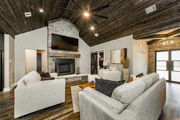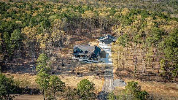 This charming 4-bedroom, 2-bath cabin sits just 1.5 miles from the marina--perfect for lake lovers and outdoor enthusiasts. The inviting entry features a rock accent wall and wooden beam ceiling detail, setting the tone for rustic elegance. Inside, the vaulted wood ceiling and rock fireplace in the living room create a warm, open space that flows into the kitchen with a large island and walk-in pantry. The primary suite boasts a vaulted ceiling, double vanities, and a custom tile shower. With 3 guest rooms and a bunk room, there's plenty of space for friends and family. Enjoy peaceful mornings and evenings on the covered front and back porches, gather under the pergola with a firepit, and keep all your lake gear in the shop with electricity. Bonus: this property offers prime hunting land with deer and turkey.