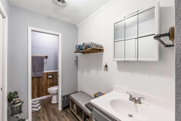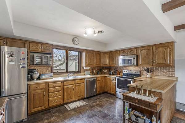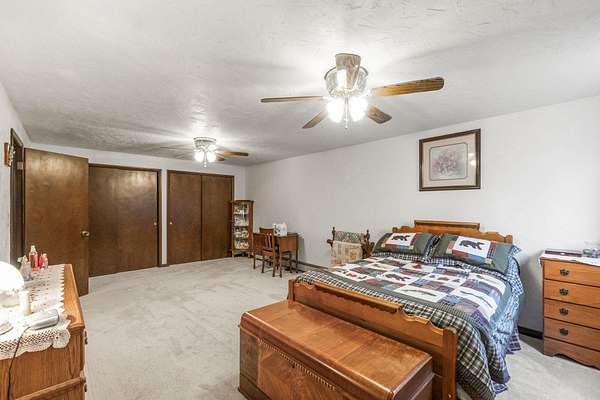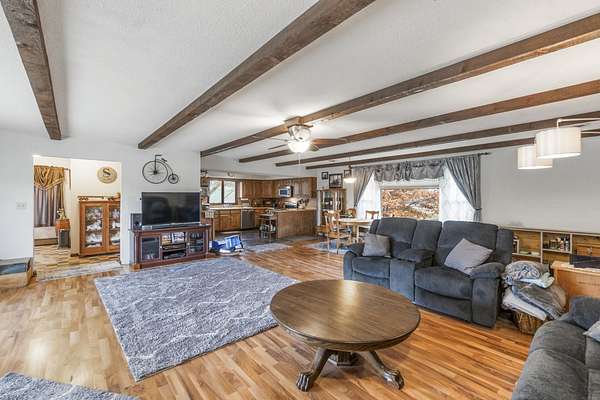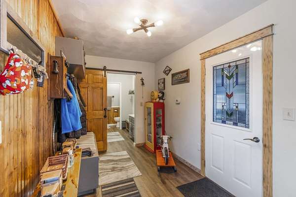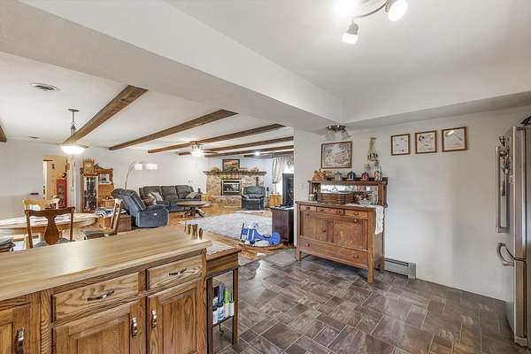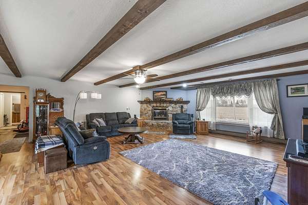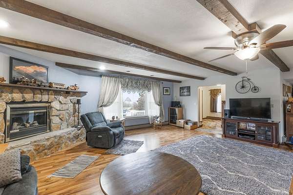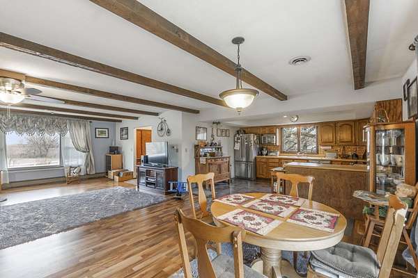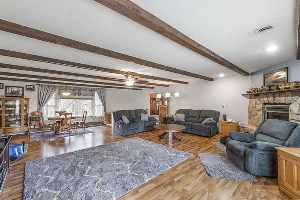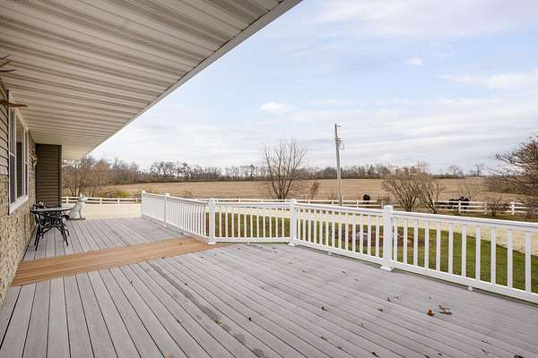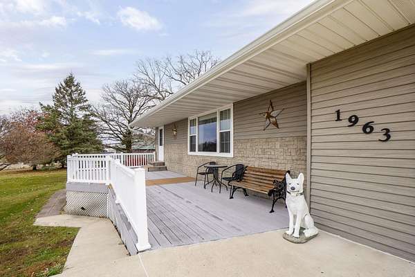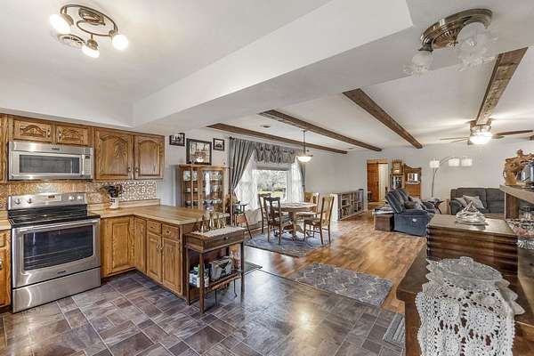 Discover the perfect blend of country serenity and modern convenience at this inviting acreage on the edge of town. Nestled on 4 picturesque acres, this spacious raised ranch offers 2,355 sq. ft. of open living space, featuring 3 comfortable bedrooms and 2.5 updated bathrooms. Enjoy scenic views and privacy, set back from Hwy C-57 in a tranquil, park-like setting. Step inside to a welcoming main floor with two generous entryways, a large living room anchored by a cozy fireplace, and a bright kitchen with classic oak cabinetry. The adjoining dining area is framed by expansive windows, perfect for watching wildlife roam the grounds. Updated laminate flooring flows throughout, including a convenient 3/4 bath with shower and a half bath near the garage entry. The lower level provides three restful bedrooms, a full bath, a laundry room, and a versatile bonus room beneath the garage-ideal for storage or hobbies. Outside, you'll find an attached two-car garage, a newer roof, durable aluminum siding, and two spacious decks for relaxing or entertaining. Two versatile outbuildings expand your possibilities: a 40 x 64 building with a paint booth, workshop, office space, water, and heat; and a 32 x 44 pole-frame building with both concrete and gravel flooring plus an overhead door-perfect for a shop, extra vehicles, or storage. This property is a true retreat, offering room to spread out and enjoy the freedom of country living, while remaining close to town amenities. Experience comfort, charm, and functionality in a home designed for both relaxation and productivity.