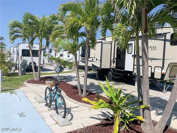 Possibly the most beautifully landscaped lot in the community and PRICED TO SELL! Desirable location only 6 lots from the community Pool, Clubhouse and Tennis Courts and more! 50 AMP ELECTRIC, Water, and Sewer available. Embrace the warm, tropical lifestyle at Palmetto Palms RV 55+ Condo HOA, where you own the land! Park your RV or place a new manufactured home on this 36x36x57x56' lot! Lot concrete is smooth with a designated bike parking area among the gorgeous landscape. Enjoy a carefree coastal lifestyle close to FMB and Sanibel. This area has so much to explore. Palmetto Palms offers boat storage and is biking or walking distance to Bunche Beach. This is a NON-Pet Friendly Lot.