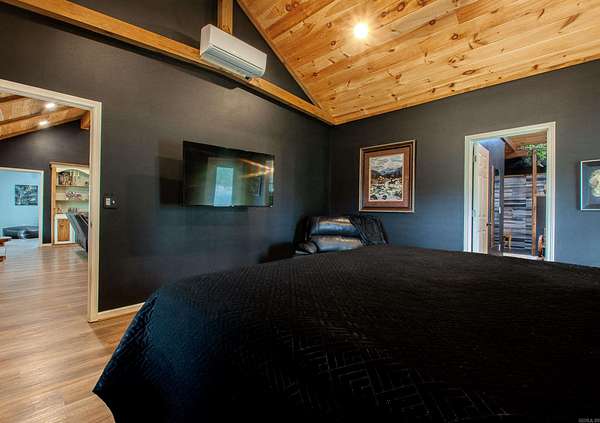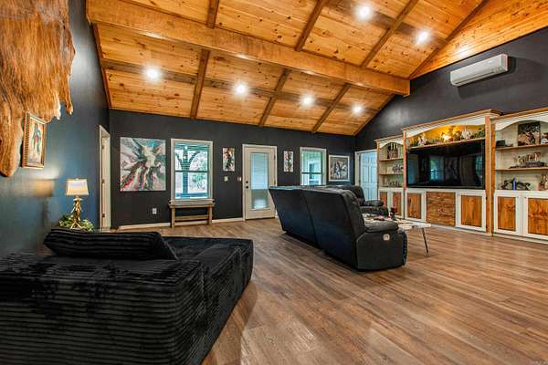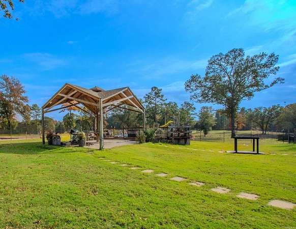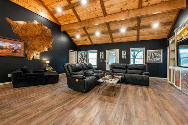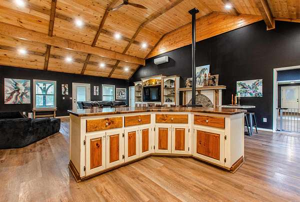 Enjoy country living at its finest on this beautiful 4.6-acre property featuring wrap-around porches, multiple fenced areas, and lush gardens with fruit trees. Several options for a 3rd bedroom or more. The grounds include a chicken coop, a relaxing gazebo, and semi in ground pool--perfect for entertaining or unwinding outdoors. With plenty of space to roam and relax, this property offers the ideal blend of comfort, privacy, and rural living. Now priced 30K below appraisal. The room features a breathtaking vaulted wooden ceiling with exposed beams, creating warmth and character that extends throughout the home. The rich wood tones are beautifully complemented by sleek, dark accent walls and recessed lighting, creating a cozy yet sophisticated atmosphere. The kitchen, seamlessly connected to the living area, showcases a large breakfast bar with seating, stainless steel appliances, and two-tone cabinetry that ties the rustic and modern aesthetics together. Luxury vinyl plank flooring runs throughout, enhancing the room's open flow and durability. Two large bedrooms can serve as a primary on either side of the home. Potential for 3rd bedroom (sitting room ). see agent remarks