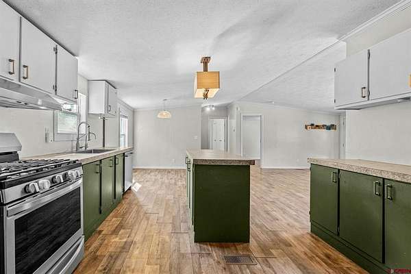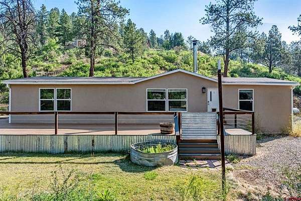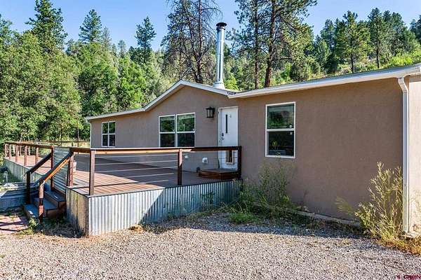 Michelle L Brown, Blackmore Group, C: 970-759-6958, michelle@homesforsaledurango.com, michellebrownhomes.com: This HUD-approved manufactured home, built in 2016 and set on a permanent foundation, offers the rare combination of privacy, flexibility, and potential. Nestled on 4.8 acres with Lake Durango water and no HOA or subdivision restrictions, the property is ideal for full-time living, or vacation rental income--as per county guidelines. Inside, the open-concept floor plan features a kitchen, dining area, and living room anchored by a wood-burning fireplace--creating a warm, central gathering space. The split layout ensures privacy, with a spacious primary suite on one end and two additional bedrooms with a shared bath on the other. Enjoy the peaceful surroundings from the front deck, complete with hooks for shade sails if desired. The property includes an 4.5 kW grid-tied solar system designed for long-term savings. An RV hookup is already in place. Additionally, a second building site is located up the hill--ready for development once permanent utilities are installed.