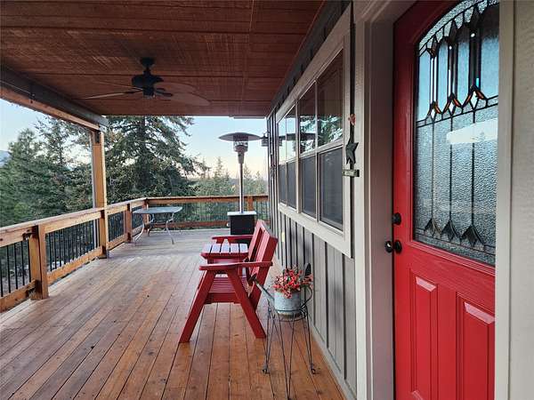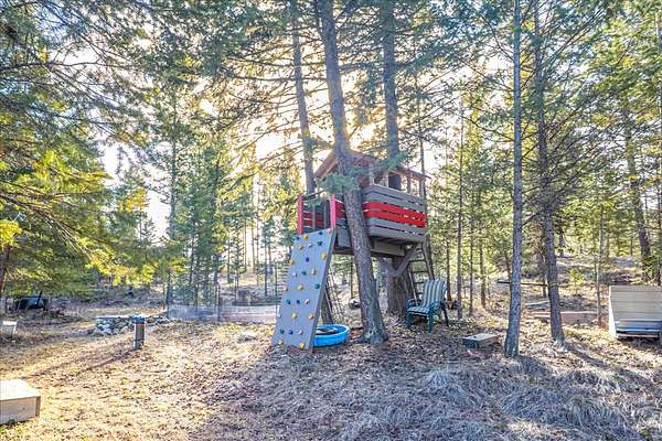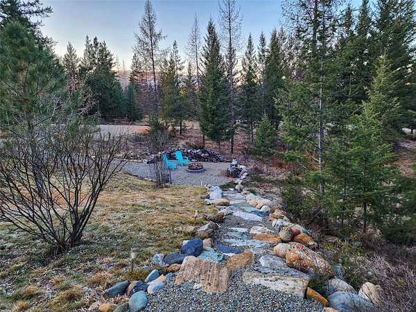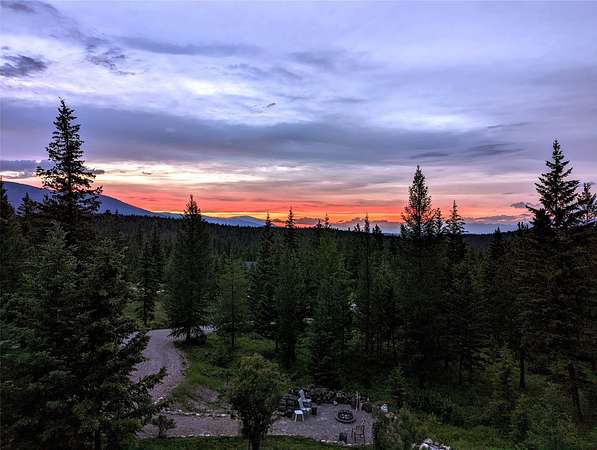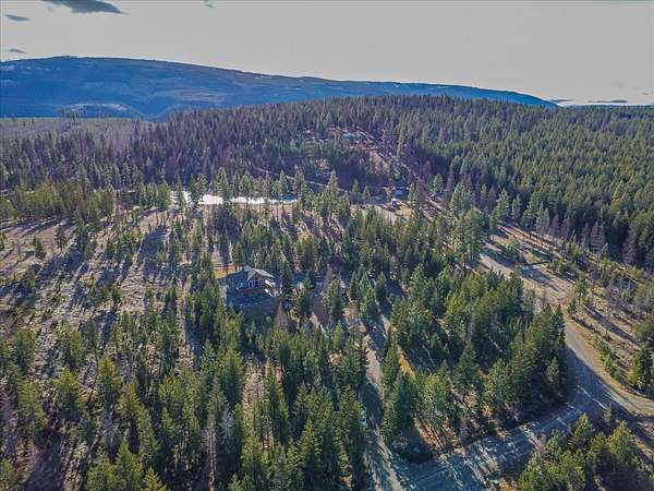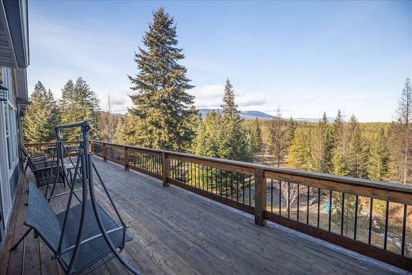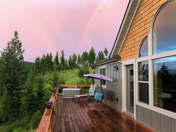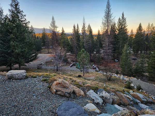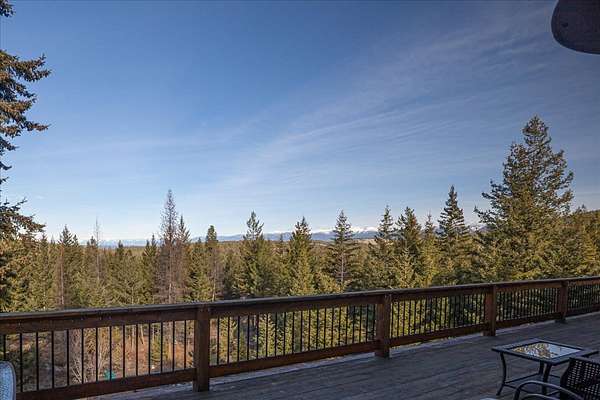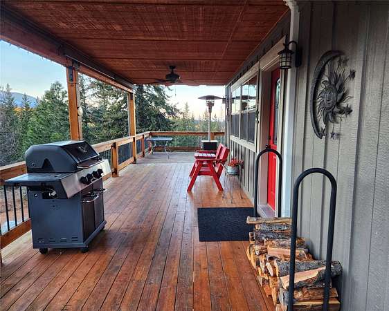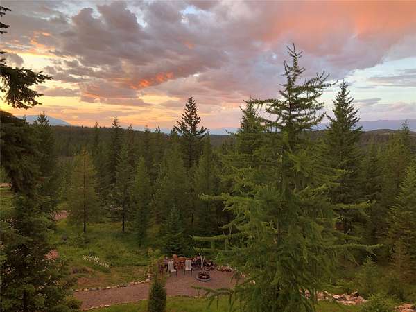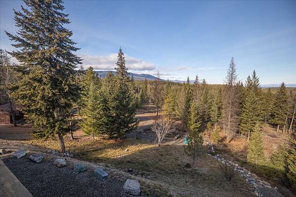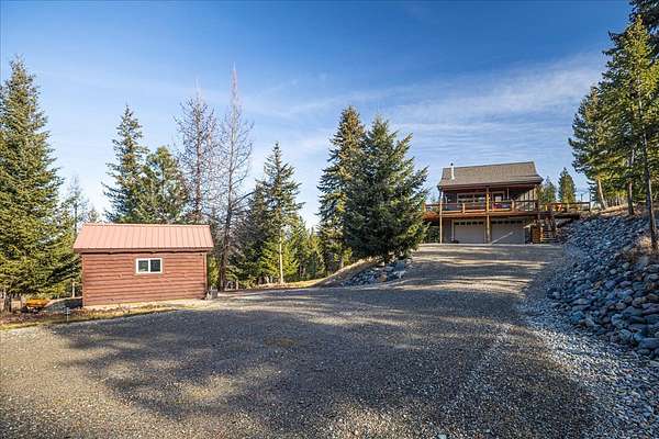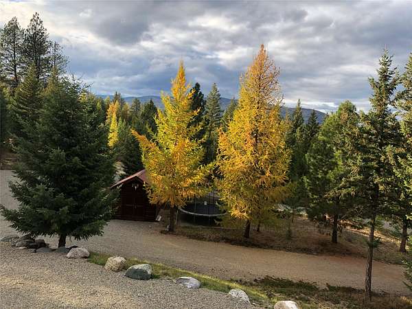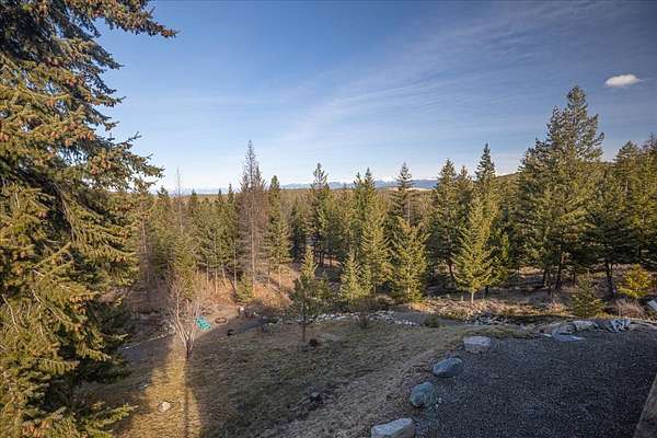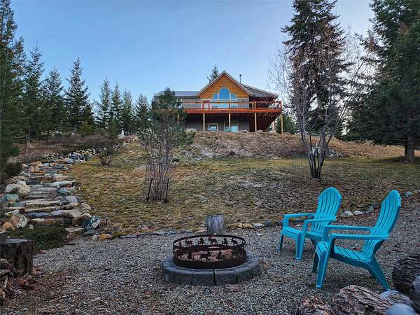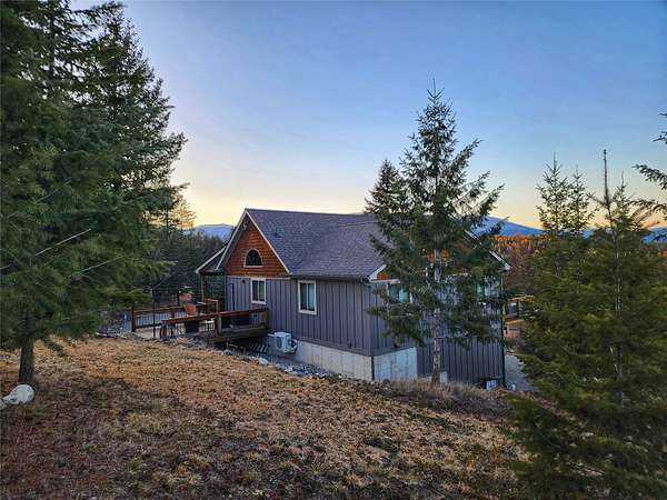 Located in the rolling hills just minutes from Lake Koocanusa and surrounded by public land, this quiet mountain neighborhood is truly a hidden gem. Situated on 2.6 private acres, this home offers peace, privacy, and breathtaking scenery. The main level features a spacious living room with floor-to-ceiling windows, showcasing stunning panoramic mountain views and filling the space with invigorating natural light. Hand-crafted timbers accent vaulted ceilings, while the corner wood-burning stove creates a warm, one-of-a-kind atmosphere perfect for relaxation. Rich hand-crafted wood cabinetry, doors, and trim are paired with stainless steel appliances and quality flooring that offers low maintenance with a modern look. Downstairs, a large bedroom opens to a half bath with a full laundry room and provides direct access to the oversized garage. Fully finished and easily adaptable into additional living space, the garage is ideal for parking, hobbies, or overflow entertaining space. Outside the land invites you to live fully with a wraparound covered deck looking out to the majestic skyline and mountains beyond. Natural rock landscaping enhances multiple recreational areas, including a fire pit, horseshoe pit, playhouse and fenced gardening area. The mature forest surrounding the home creates room to relax, entertain, and explore. An easy circular driveway with additional RV parking/hookup adds convenience for guests or adventure-ready living. Tucked at the back of the subdivision, this property offers unmatched quiet, privacy, and mountain living at its finest.