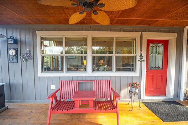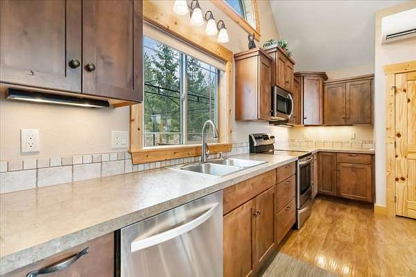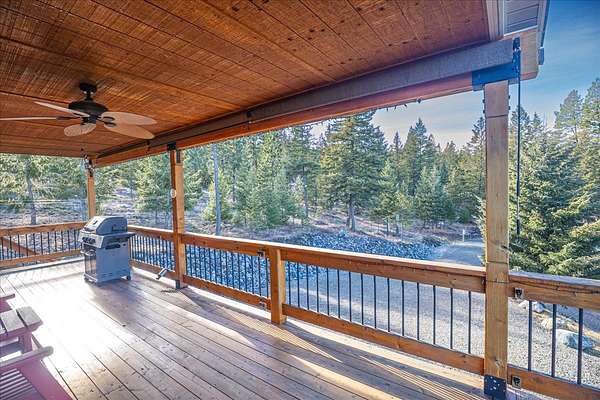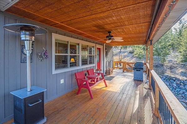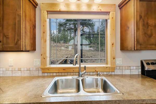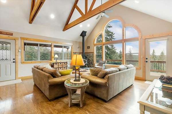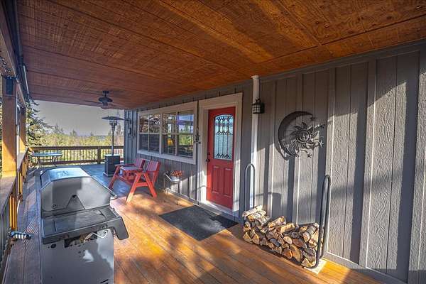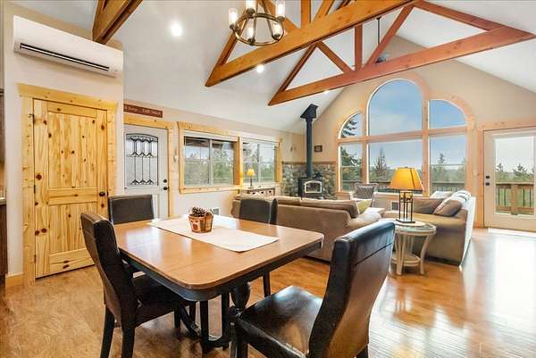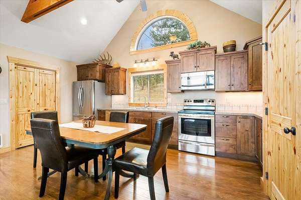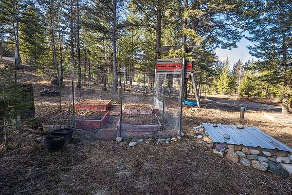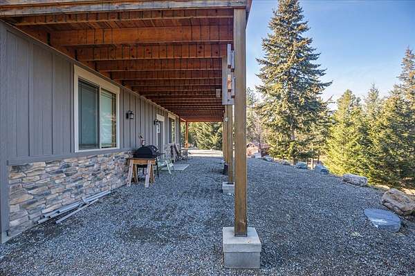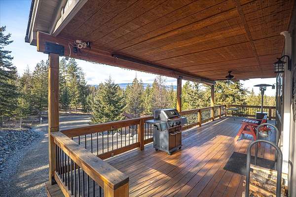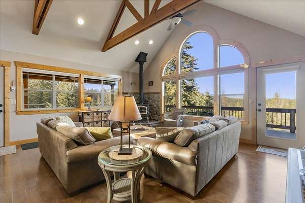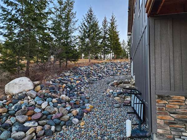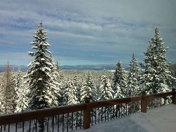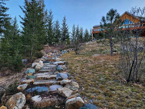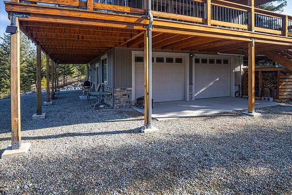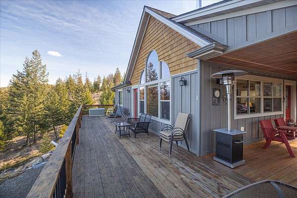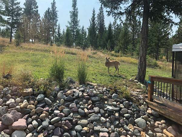 Located in the rolling hills just minutes from Lake Koocanusa and surrounded by public land, this quiet mountain neighborhood is truly a hidden gem. Situated on 2.6 private acres, this home offers peace, privacy, and breathtaking scenery. The main level features a spacious living room with floor-to-ceiling windows, showcasing stunning panoramic mountain views and filling the space with invigorating natural light. Hand-crafted timbers accent vaulted ceilings, while the corner wood-burning stove creates a warm, one-of-a-kind atmosphere perfect for relaxation. Rich hand-crafted wood cabinetry, doors, and trim are paired with stainless steel appliances and quality flooring that offers low maintenance with a modern look. Downstairs, a large bedroom opens to a half bath with a full laundry room and provides direct access to the oversized garage. Fully finished and easily adaptable into additional living space, the garage is ideal for parking, hobbies, or overflow entertaining space. Outside the land invites you to live fully with a wraparound covered deck looking out to the majestic skyline and mountains beyond. Natural rock landscaping enhances multiple recreational areas, including a fire pit, horseshoe pit, playhouse and fenced gardening area. The mature forest surrounding the home creates room to relax, entertain, and explore. An easy circular driveway with additional RV parking/hookup adds convenience for guests or adventure-ready living. Tucked at the back of the subdivision, this property offers unmatched quiet, privacy, and mountain living at its finest.