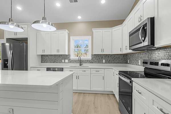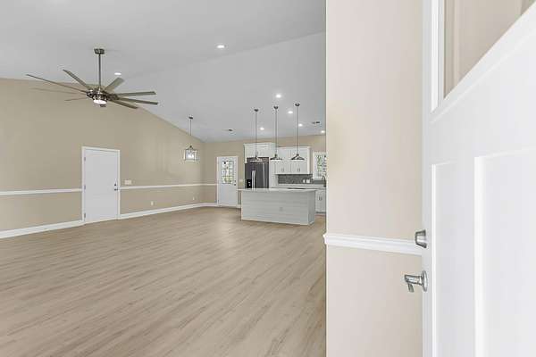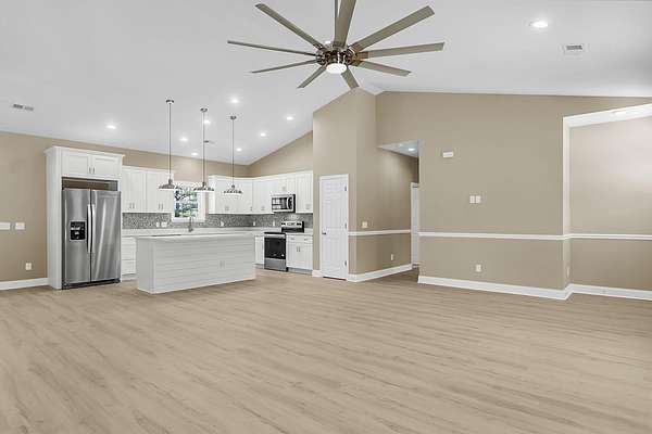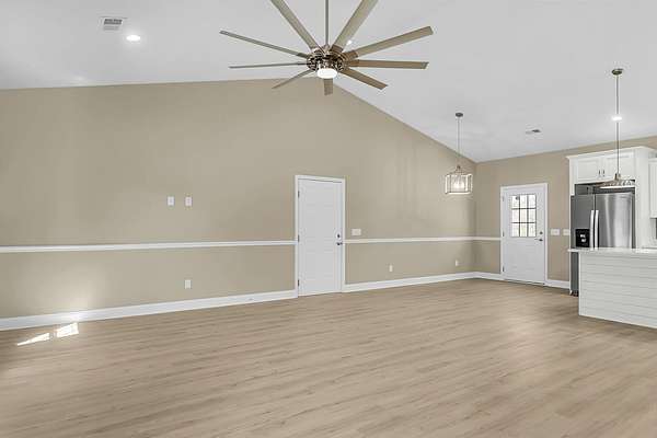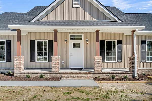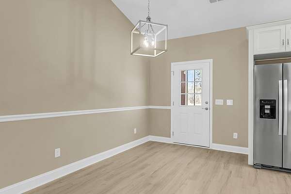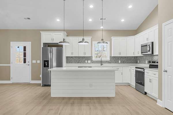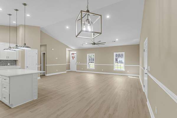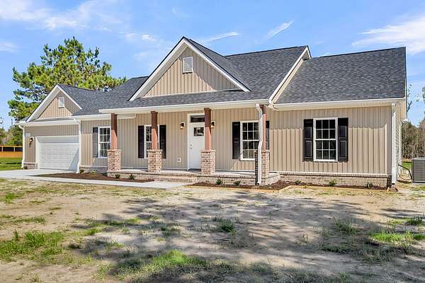 197 Dandelion Ct blends modern comfort with peaceful surroundings in this spacious 3-bedroom, 2-bath home offering approximately 1,500 square feet and a 2-car garage. Designed with an open floorplan and stylish luxury vinyl flooring, this newer home feels both inviting and functional from the moment you step inside. The bright, airy living space features vaulted ceilings and ceiling fans, creating a light-filled atmosphere perfect for everyday living and entertaining. The kitchen is a standout, complete with a center island and breakfast bar, granite countertops, tile backsplash, stainless steel appliances, and a pantry for added storage. The large owner's suite offers a relaxing retreat with elegant coffered ceilings, a walk-in closet with built-in features, and an en suite bathfeaturing dual sinks, a garden tub, and a separate walk-in shower. Enjoy quiet country living while still being conveniently close to the city. The cleared backyard with a wooded buffer provides added privacy and a serene outdoor setting. The spacious 24x24 garage includes a Level 2 EV charger, adding modern convenience to this well-appointed home.