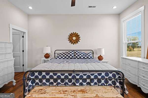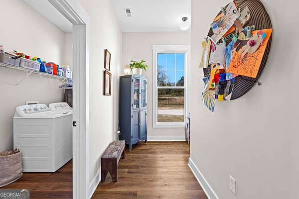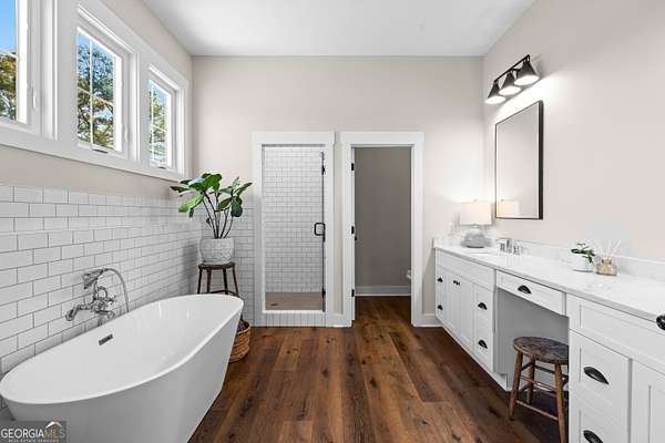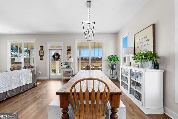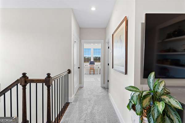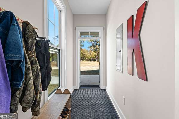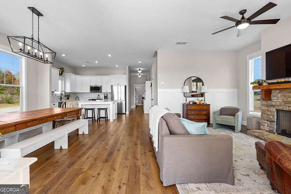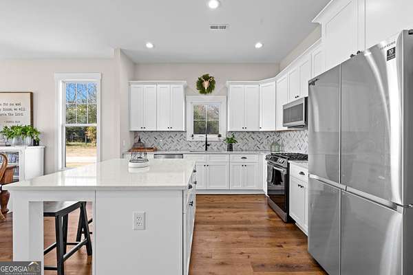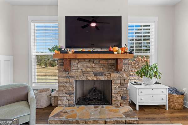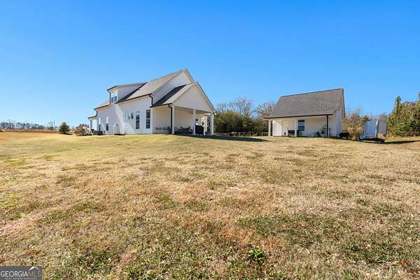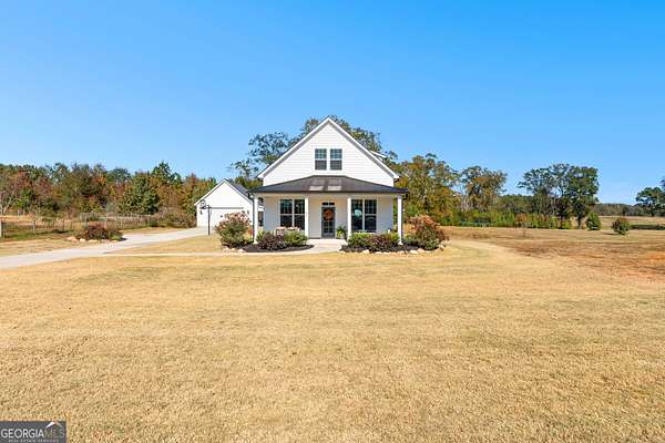 Beautiful Custom-Built Modern Farmhouse on 2.71 Acres in Molena! Fall in love the moment you arrive at this charming 3-bedroom, 3.5-bath home nestled on a peaceful piece of countryside. The inviting open floorplan is perfect for everyday living and entertaining, featuring a spacious family room with a cozy stone fireplace, large dining area, and a gorgeous kitchen with plenty of cabinets, beautiful quartz countertops, tile backsplash, a big island with breakfast bar, and a walk-in pantry. The owner's suite on the main level offers a relaxing retreat with a large vanity, tile shower with glass door, and a soaking tub surrounded by beautiful tile. Upstairs, each bedroom has its own private bath plus there's a great media loft-ideal for movie nights, homework, or hanging out. Enjoy peaceful mornings on the rocking chair front porch and quiet evenings on the covered back patio overlooking the spacious backyard. You'll also love the 2-car detached garage with a lean-to area-perfect for storing lawn equipment or outdoor toys. Built with energy-efficient spray foam insulation, this home is as practical as it is beautiful. Country living at its best-come see why you'll want to call this place home!