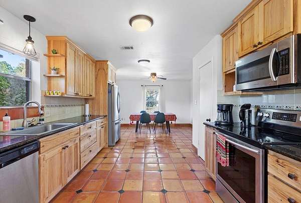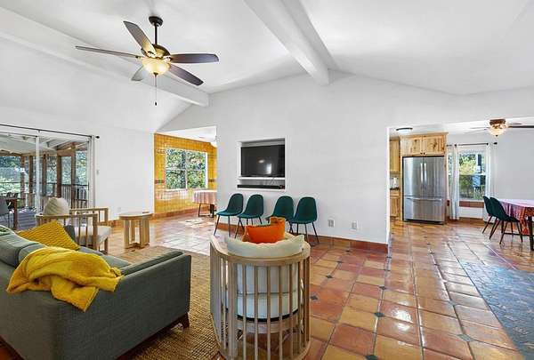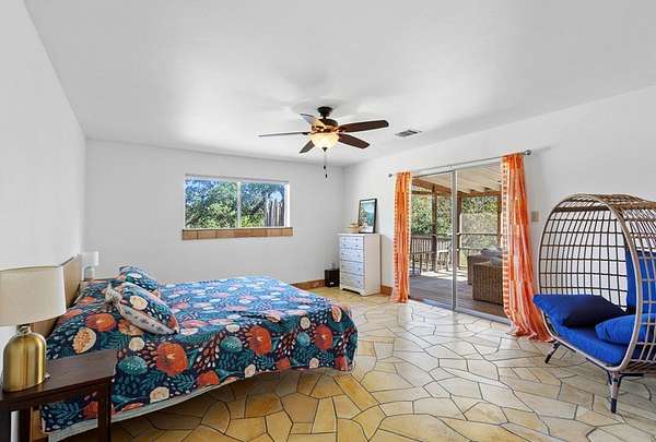 Set on 2.5 serene acres with approximately 90 feet of Little Blanco River frontage, this inviting property blends natural beauty, privacy, and convenience in the heart of the Hill Country. Located less than 10 minutes from Blanco, with easy access to Northwest San Antonio (45 minutes), Downtown Austin (1 hour), and a scenic drive to Fredericksburg (45 minutes), it's ideally positioned for both everyday living and weekend escapes. The 3-bedroom, 2-bathroom main home offers 1,838 square feet and showcases timeless character. Classic Saltillo-style tile floors run throughout the living areas, complemented by hand-laid decorative tiles in the kitchen, dining spaces and bathrooms, adding warmth, texture, and a true Southwestern feel. In the primary bedroom, flagstone-pattern tile floors bring a rustic, organic elegance, while the large screened-in patio provides peaceful views of the river and surrounding landscape. A separate detached efficiency cottage - approximately 400 square feet - includes a full bathroom and is perfect as a guest suite, office, creative studio, or workshop. The property is three sides fenced with a gated entry, offers ownership of both sides of the waterfront, and enjoys abundant privacy amid large oak trees, cypress trees, and ample wildlife. Additional features include raised garden beds with deer-resistant native plants and herbs, a chicken coop, and a gently wooded landscape that enhances the quiet, natural setting. With its blend of river frontage, charm, and accessibility, this property is an exceptional opportunity for a personal homestead, weekend retreat, or short-term rental investment.
