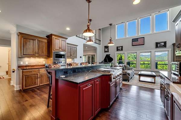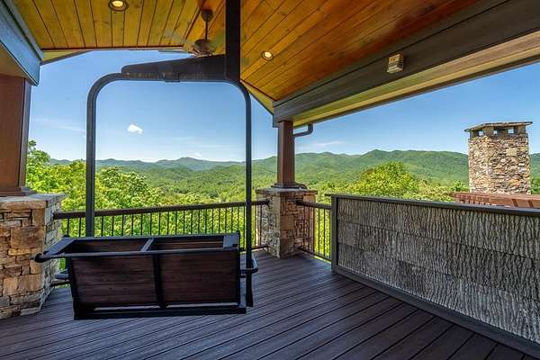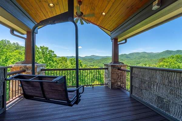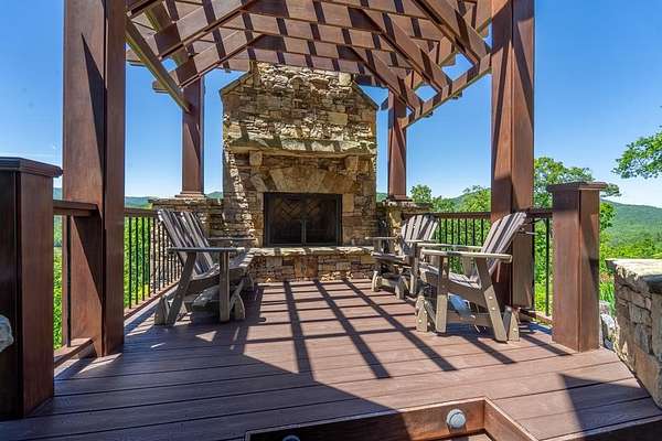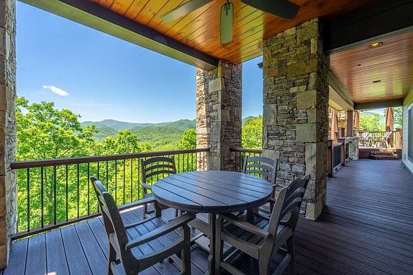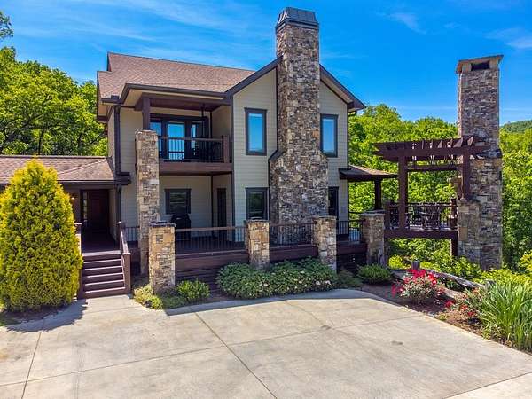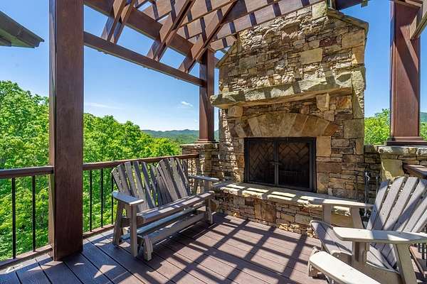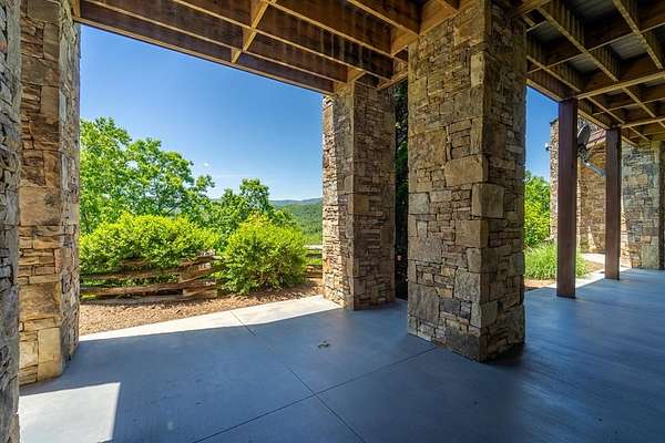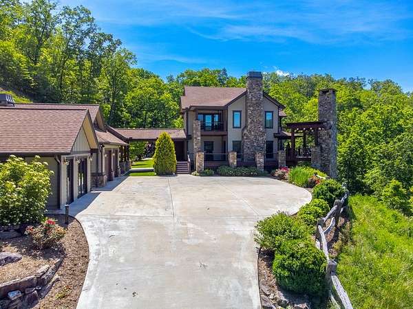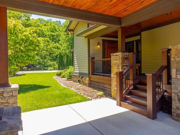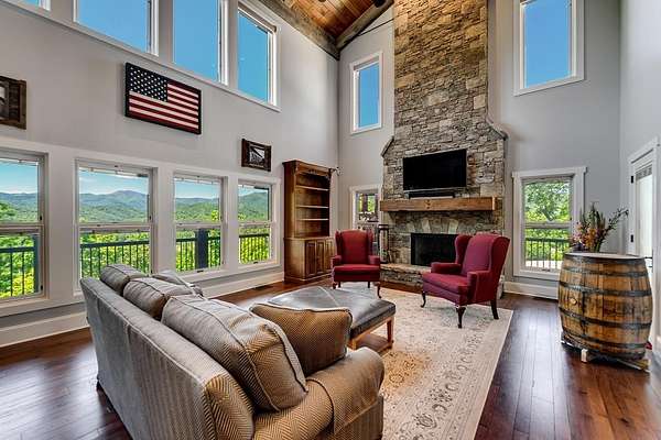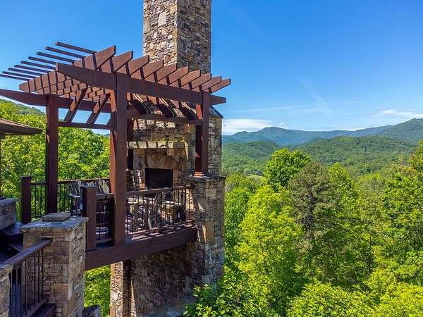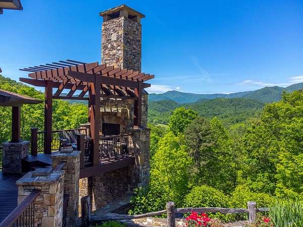 Located less than 10 minutes from the airport, come experience the perfect blend of craftsmanship, comfort, and mountain beauty in this stunning custom home overlooking layers of long-range mountain views. Designed to embrace its natural surroundings, this property offers exceptional indoor-outdoor living and high-end finishes throughout. This home features a propane generator for peace of mind and expansive covered decks and porches ideal for relaxing or entertaining while taking in the panoramic scenery. A dramatic outdoor stone fireplace and pergola seating area create the ultimate mountain ambiance. Inside, the great room showcases soaring vaulted ceilings with exposed beams, rich wood finishes, and a striking floor-to-ceiling stone fireplace. Oversized windows flood the space with natural light and frame the mountain vistas. The open layout flows seamlessly into a well-appointed kitchen with custom cabinetry and quality finishes. Enjoy multiple outdoor living areas, including a covered deck with swing, perfect for morning coffee or sunset views. The home's architecture blends natural stone, warm wood tones, and quality materials that complement the landscape beautifully.