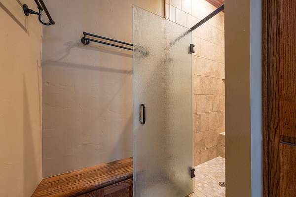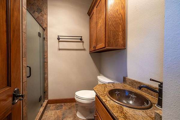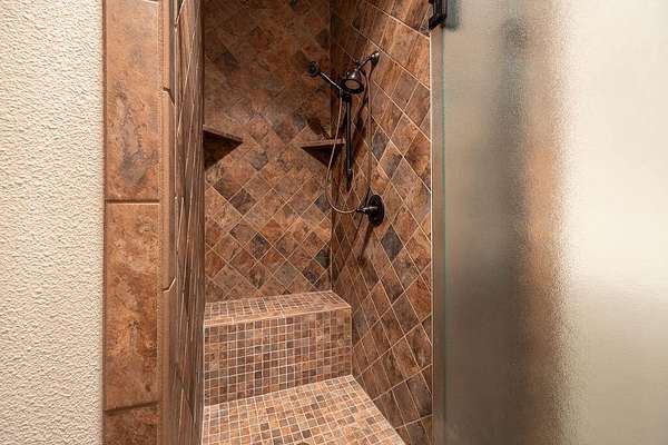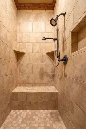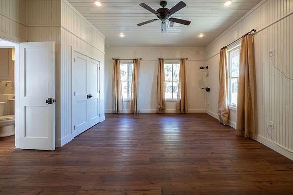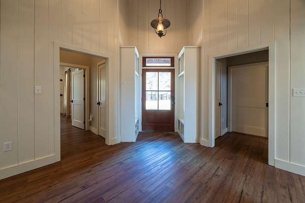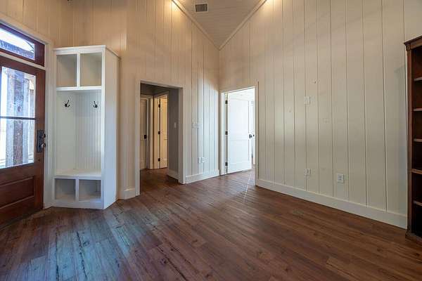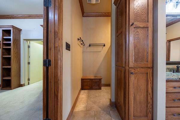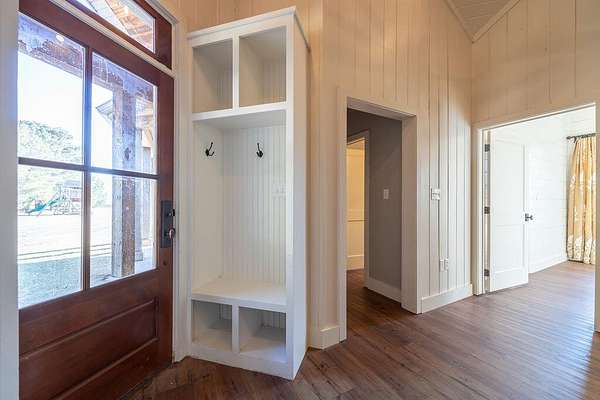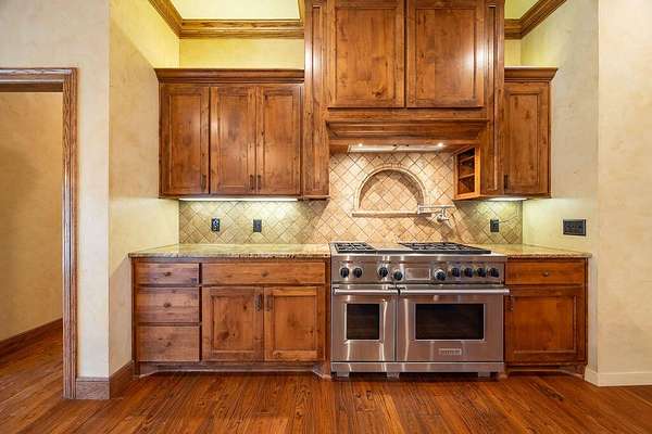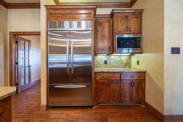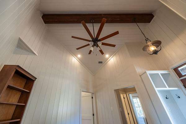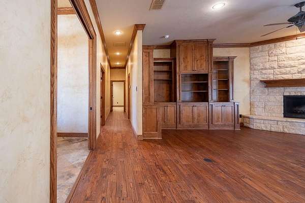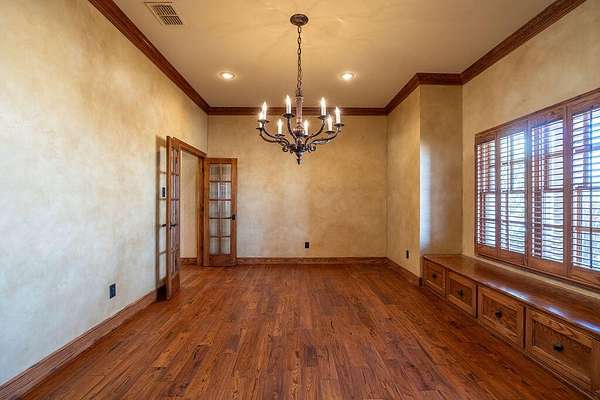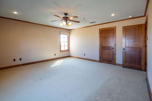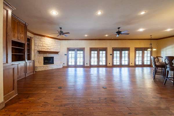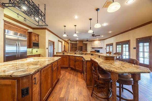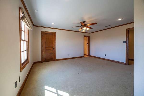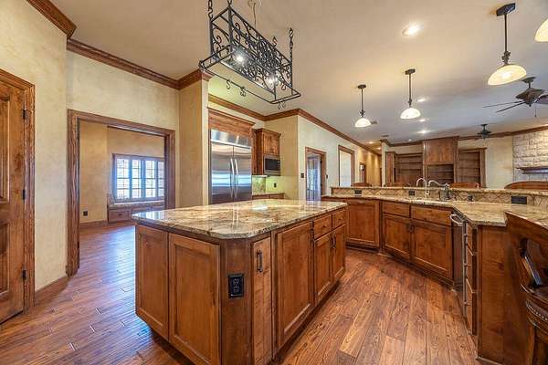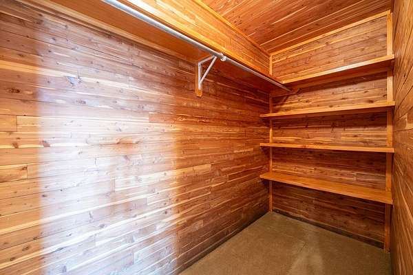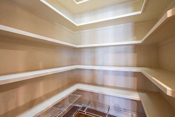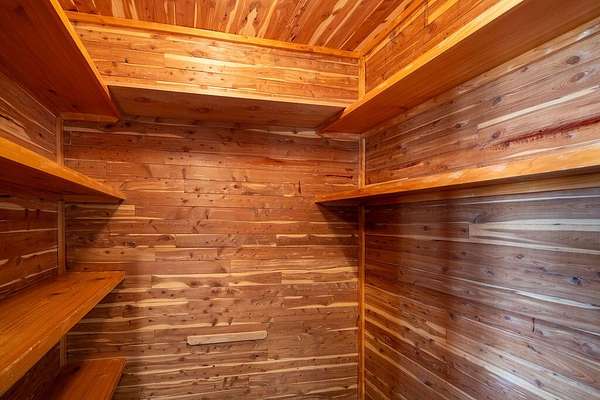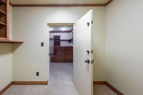- Bookcases, Cedar Closet(s), Ceiling Fan(s), Crown Molding, Double Vanity, Granite Counters, High Ceilings, Kitchen Island, Natural Woodwork, Open Floorplan, Pantry, Primary Downstairs, Safe Room, Soaking Tub, Walk-In Closet(s)
