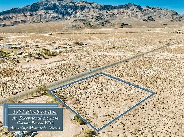 Nicely Nestled Near The Base Of Shadow Mountain Is Where You'll Find 1971 W. Bluebird Avenue~~~This Fabulous 2.5 Acre Parcel Offers A Fantastic Corner Position, Allowing You To Access Your Property Via Leslie St. Or Bluebird Ave.~~~Located In Northern Pahrump, Less Than 15 Minutes To The Center Of Town & Splendidly Situated In A Beautiful Area With Larger Sized Parcels, Wide Open Spaces & Spectacular Mountain Views~~~Power Is Already At The Property Line & (As With Most Pahrump Acreage) It Is Zoned For Private Well & Septic With Water Rights Being Required~~~Ask About Lenders That Are Now Offering Land Loans With 20% Down & Monthly Payments~~~You'll Have Amazing Sunsets & More Than 100,000 Square Feet To Work With On This Exceptional 2.5 Acre Parcel~~~Priced Great At Less Than 20k An Acre & Packed With Potential, Make This The Place For Your Pahrump Plans Today!