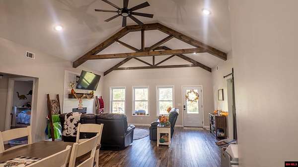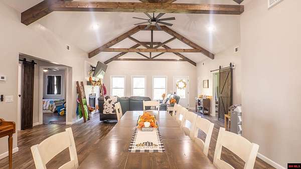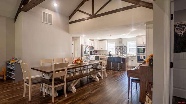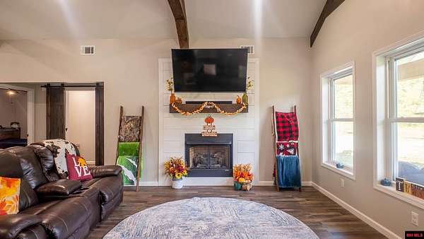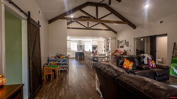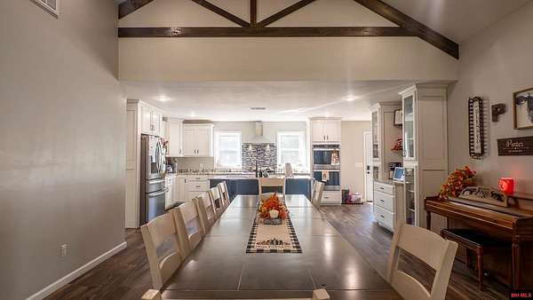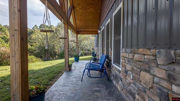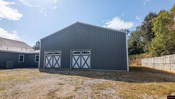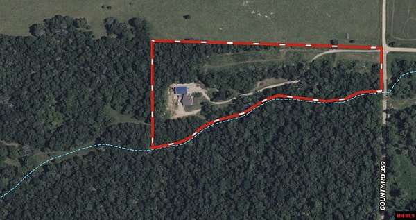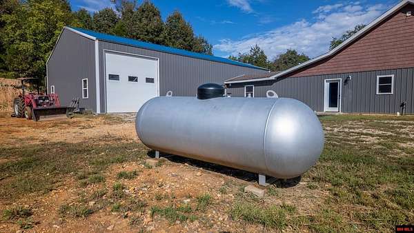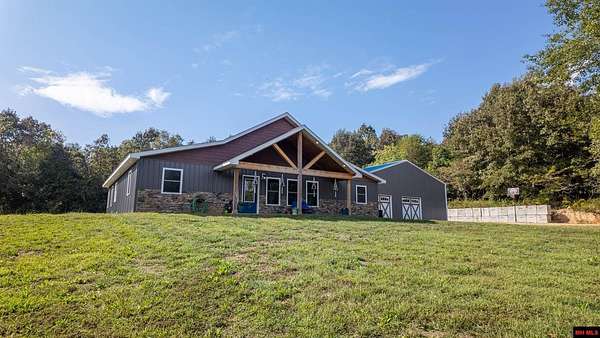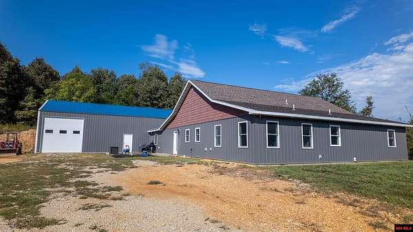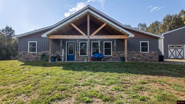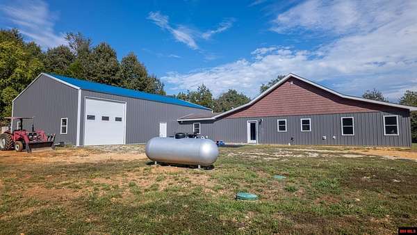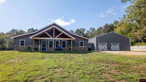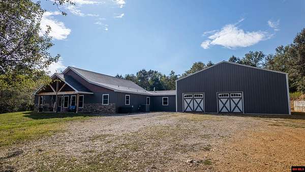 Hobby Farm in the Ozarks Experience peaceful Ozarks living in this 4 bedroom, 2.5 bath country home built in 2022 on about 11 wooded ac m/l. Designed for comfort and the outdoor lifestyle, it pairs modern features with rural charm. Inside, the open layout features vaulted ceilings, LVP flooring, and handmade wood kitchen cabinets with granite. Dual fuel central HVAC and cellulose insulation provide year round efficiency. The primary closet doubles as a storm shelter with 6 inch concrete and a commercial grade fireproof door. Relax on the covered front porch and watch deer and wildlife. The mostly wooded acreage offers privacy, whitetail hunting, and quiet exploring down a private drive with no visible neighbors. A 40x60 steel framed shop and garage adds 2,400 sq ft for storage or a workshop; a 12x12 bathroom is already plumbed. Whether you want a hobby farm, a hunting retreat, or a serene escape near town amenities, this property delivers comfort, seclusion, and classic Ozarks living.